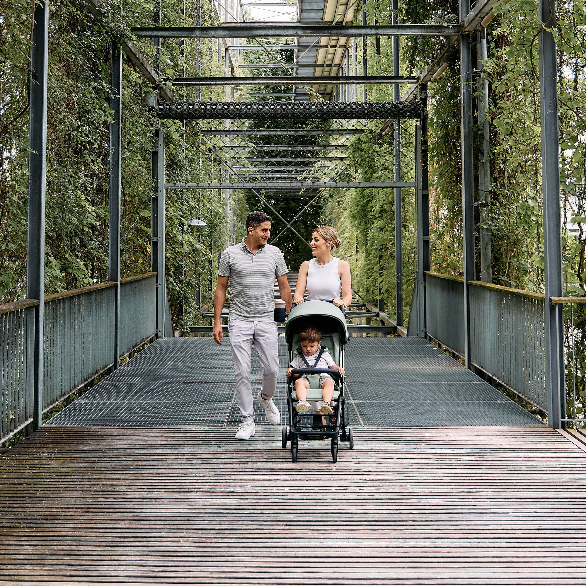 Система безопасности HappyBelt® с 5-точечными ремнями оснащена магнитной застёжкой и плавной регулировкой спереди. Мягкие плечевые накладки удобны для ребёнка и упрощают процесс фиксации. Стояночный тормоз, расположенный у правого заднего колеса, позволяет обойтись без задней оси, что даёт больше пространства для шагов и снижает вес коляски.