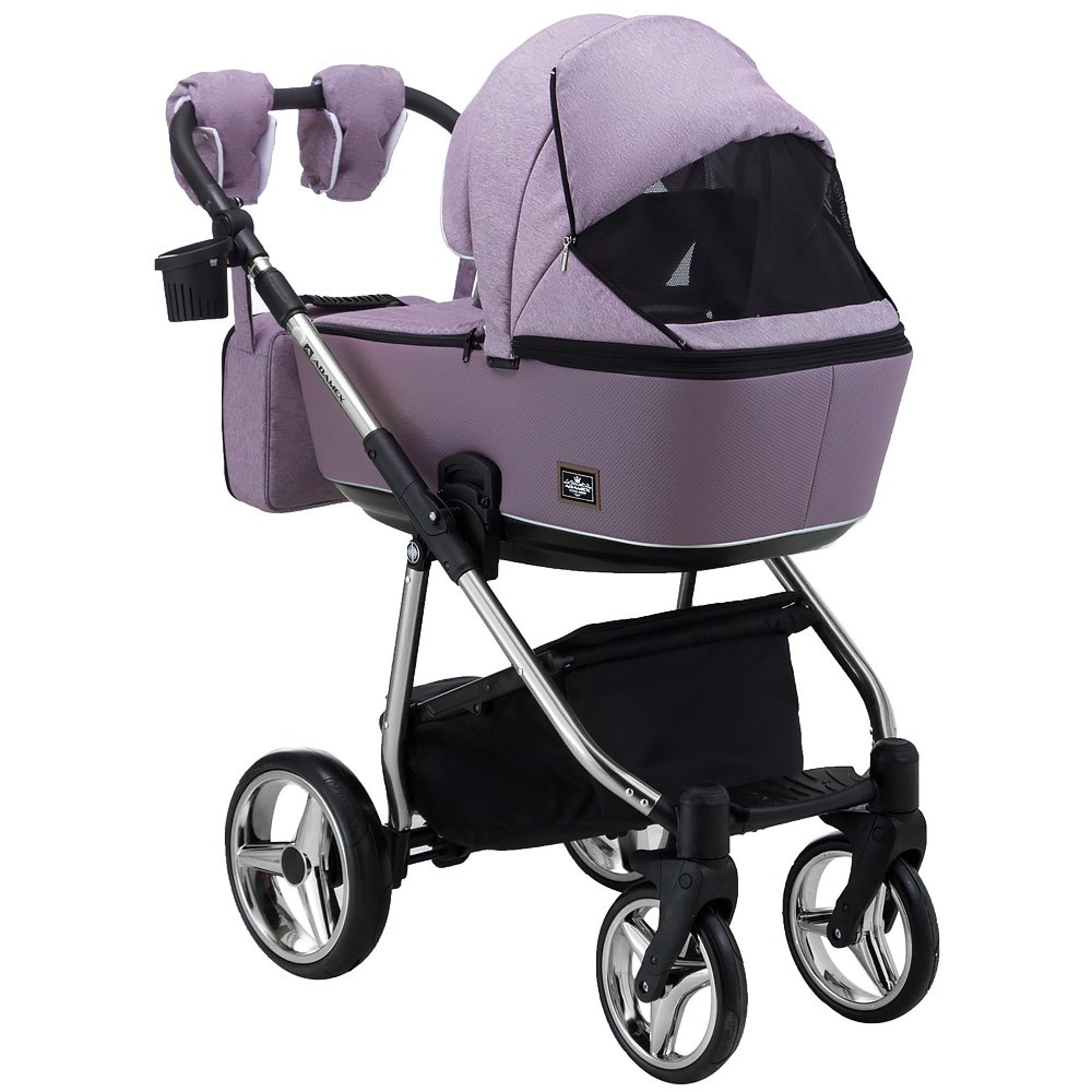 Мягкая пружинная амортизационная и поворотные передние колеса позволяет комфортно путешествовать по неровной или ровной поверхности. Коляска укомплектована стильной вместительной сумкой для мамы и закрытой корзиной для покупок, съёмным держателем для бутылочек, москитной сеткой и дождевиком.