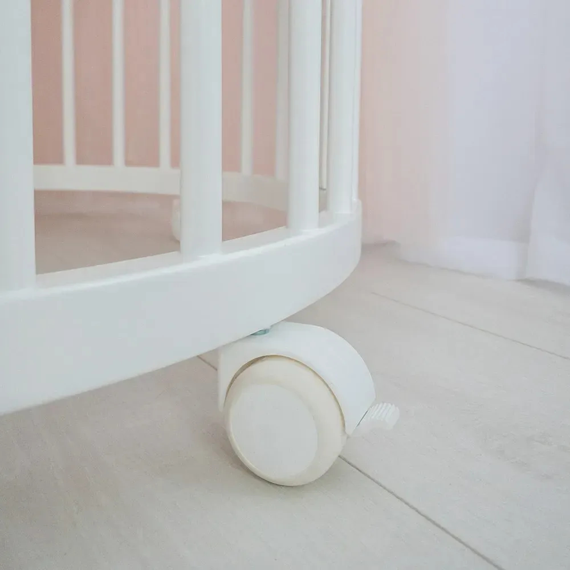 Белые прорезиненные бесшумные колеса станут отличной заменой стандартным пластиковым роликам. Они обеспечивают плавное и тихое перемещение детской кроватки, не повреждают напольное покрытие и гарантируют устойчивость конструкции.