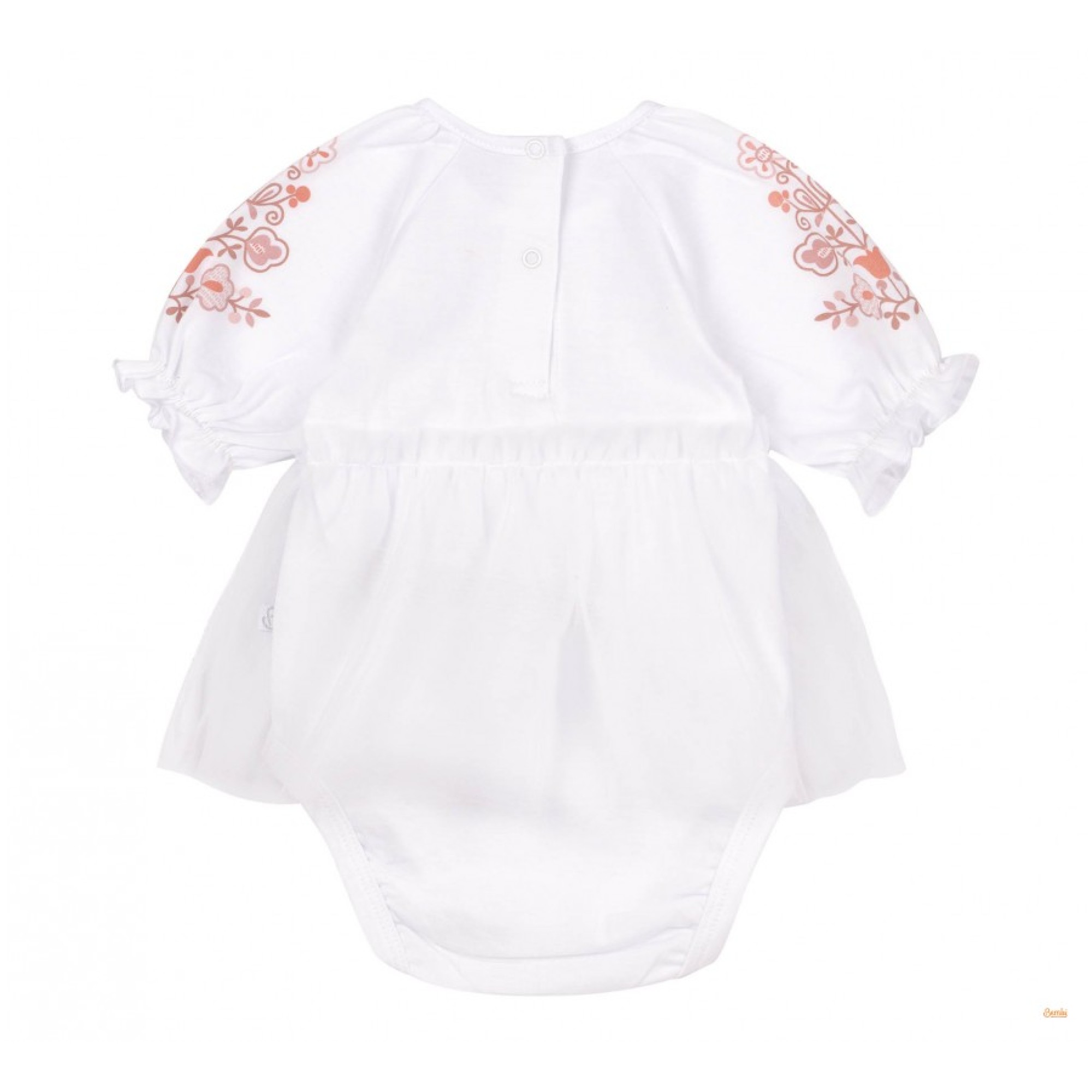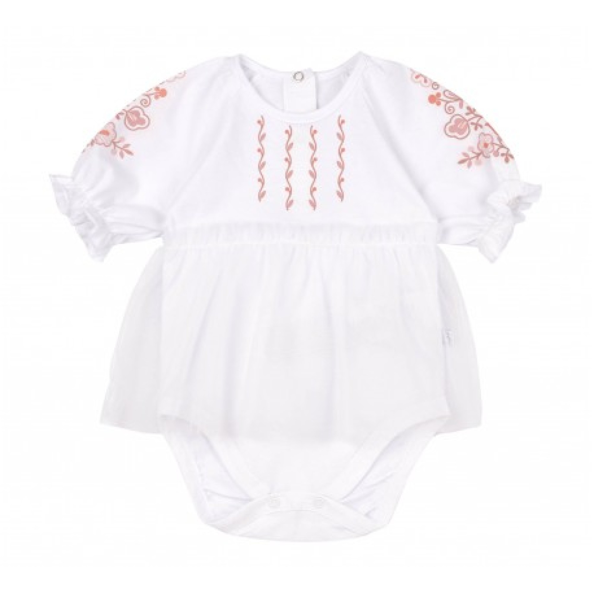 Нежный боди для девочки от бренда Bembi, выполненный в этно-стиле. Изделие украшено вышивкой на рукавах и спереди, что придаёт особый шарм и подчеркивает традиционные мотивы. Модель имеет короткие рукава с рюшами и удобную застежку на кнопки внизу для легкого переодевания. Боди изготовлен из мягкой хлопковой ткани, которая обеспечивает комфорт для ребенка в течение всего дня.