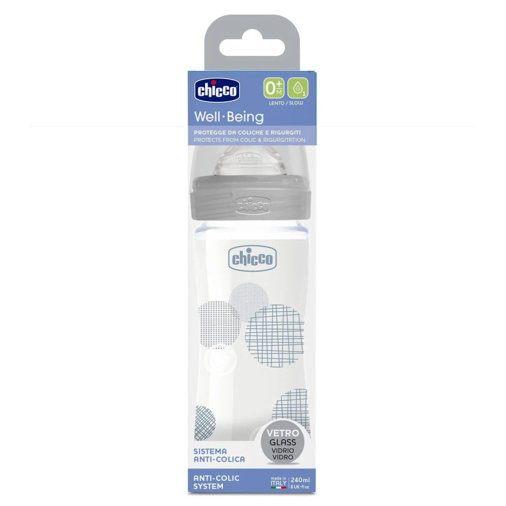 Бутылочка стекло Chicco Well-Being Physio, 240мл, соска силикон, 0м+, серый (28721.30)