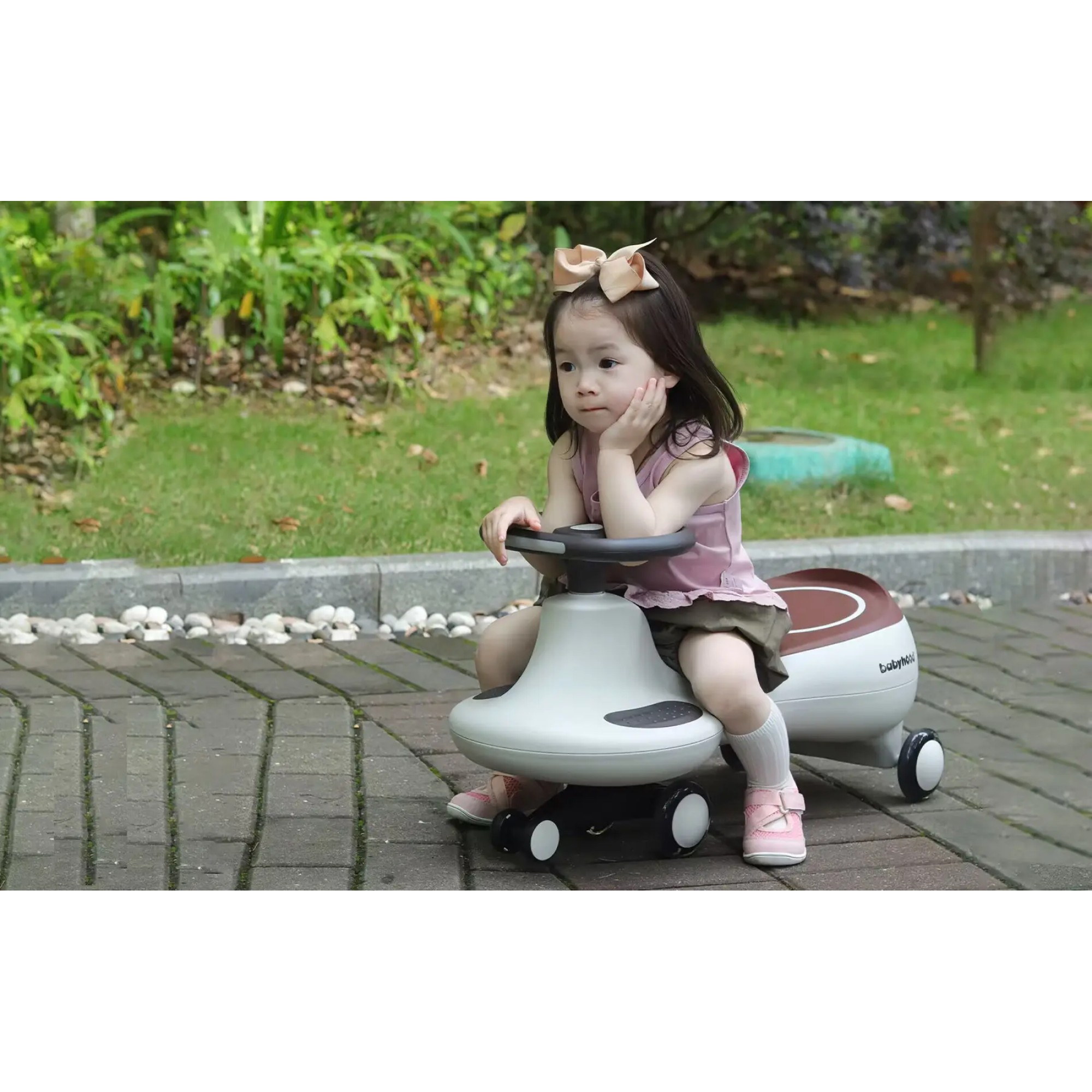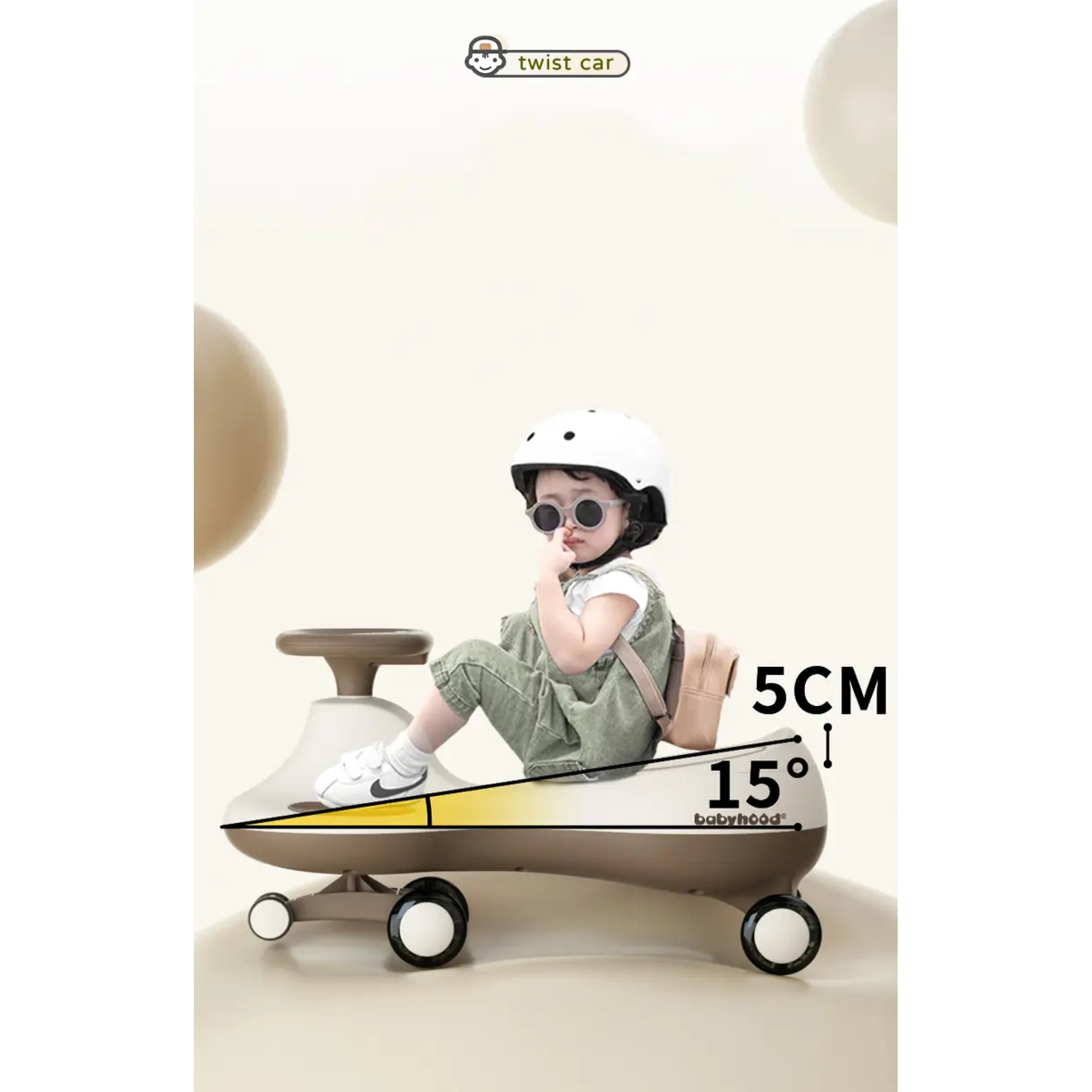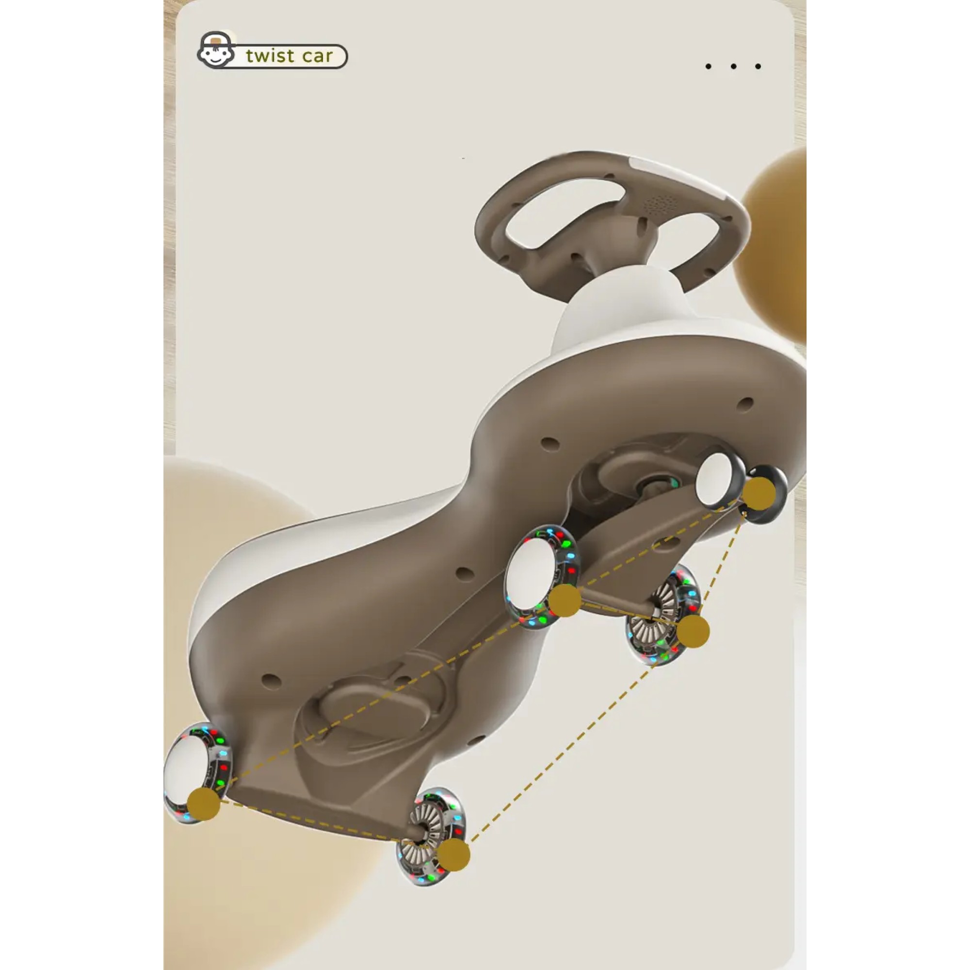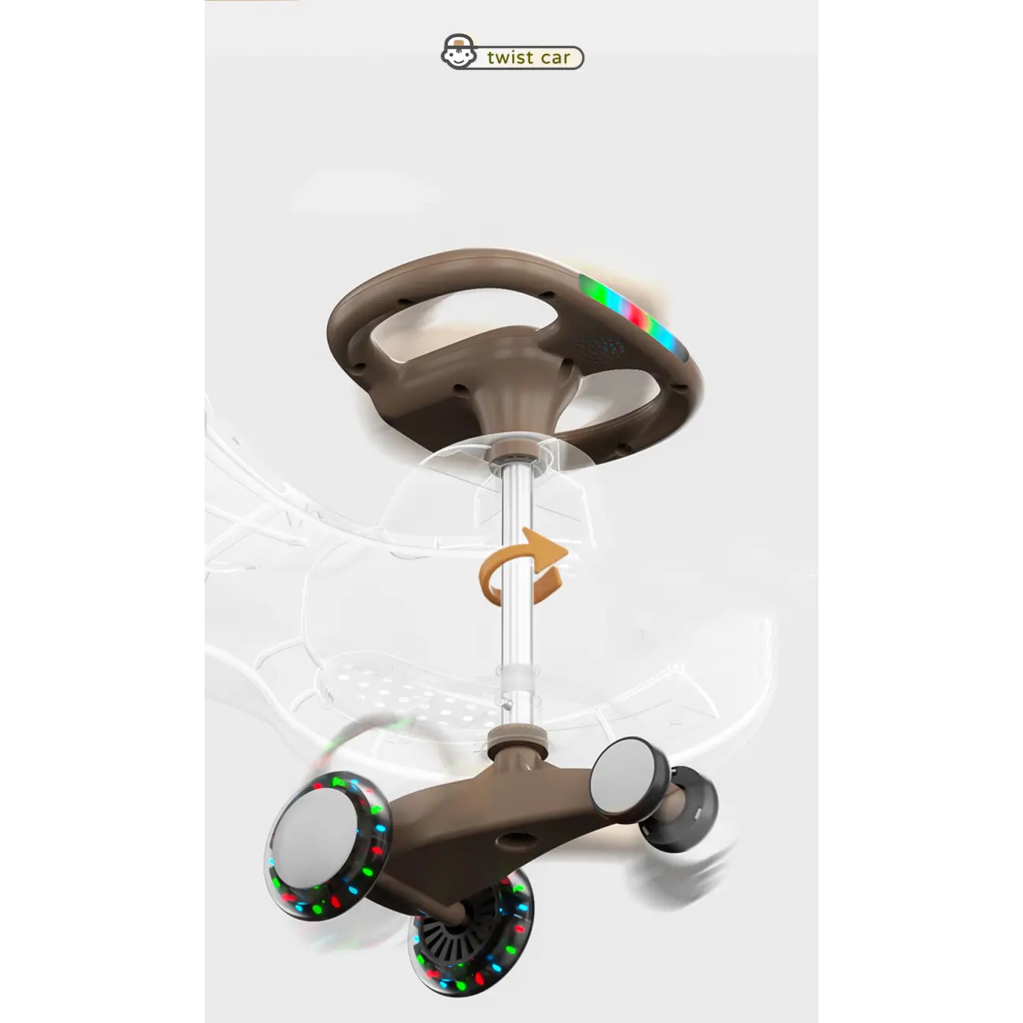 - Самоходный механизм: Машинка движется благодаря повороту руля, что не требует батареек или педалей. Это позволяет детям легко управлять ею, просто поворачивая руль.