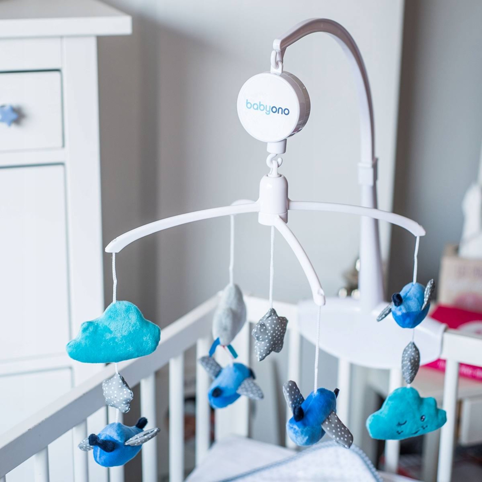Универсальная карусель Облака и самолетики BabyOno - формирует эмоциональное и социальное развитие ребенка. Весёлые птички и забавные тучки привлекают внимание малыша, а звук мелодии помогает успокоиться.