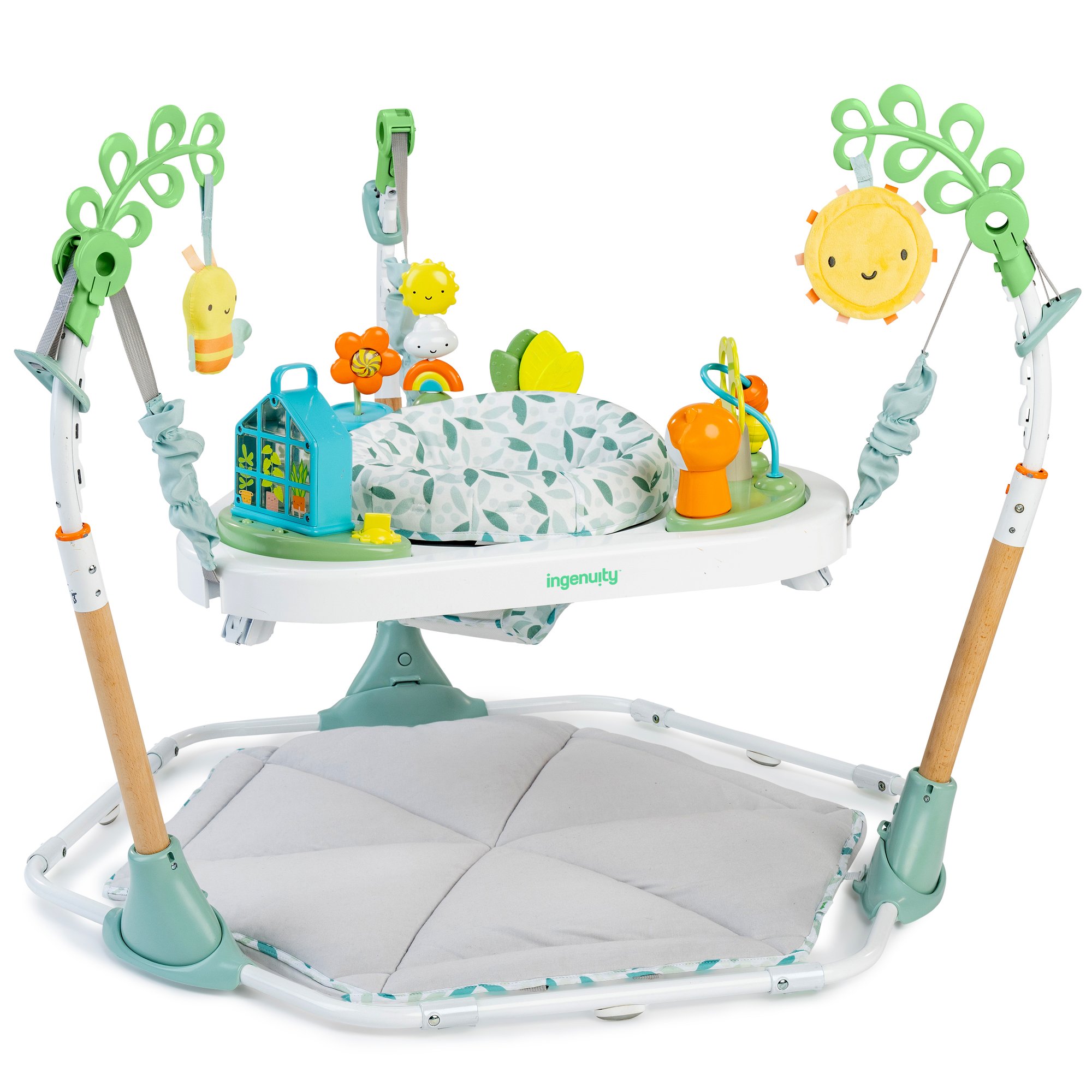 - 4 уровня высоты сиденья стрибунка, которое вращается на 360 градусов вокруг столика, обеспечивая доступ ко всем игрушкам и активностям;