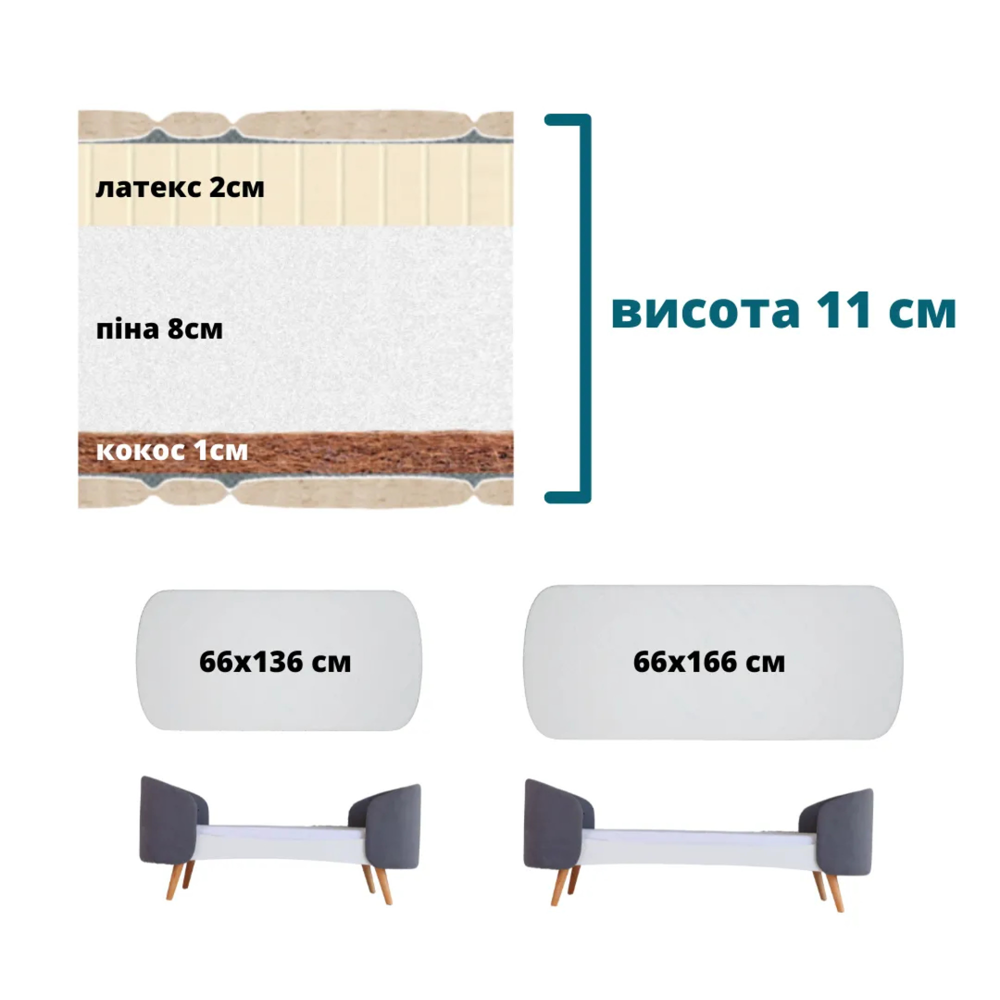 матрас на детскую кроватку (кокосовая койра, пена, латекс) • 66х136х11 см