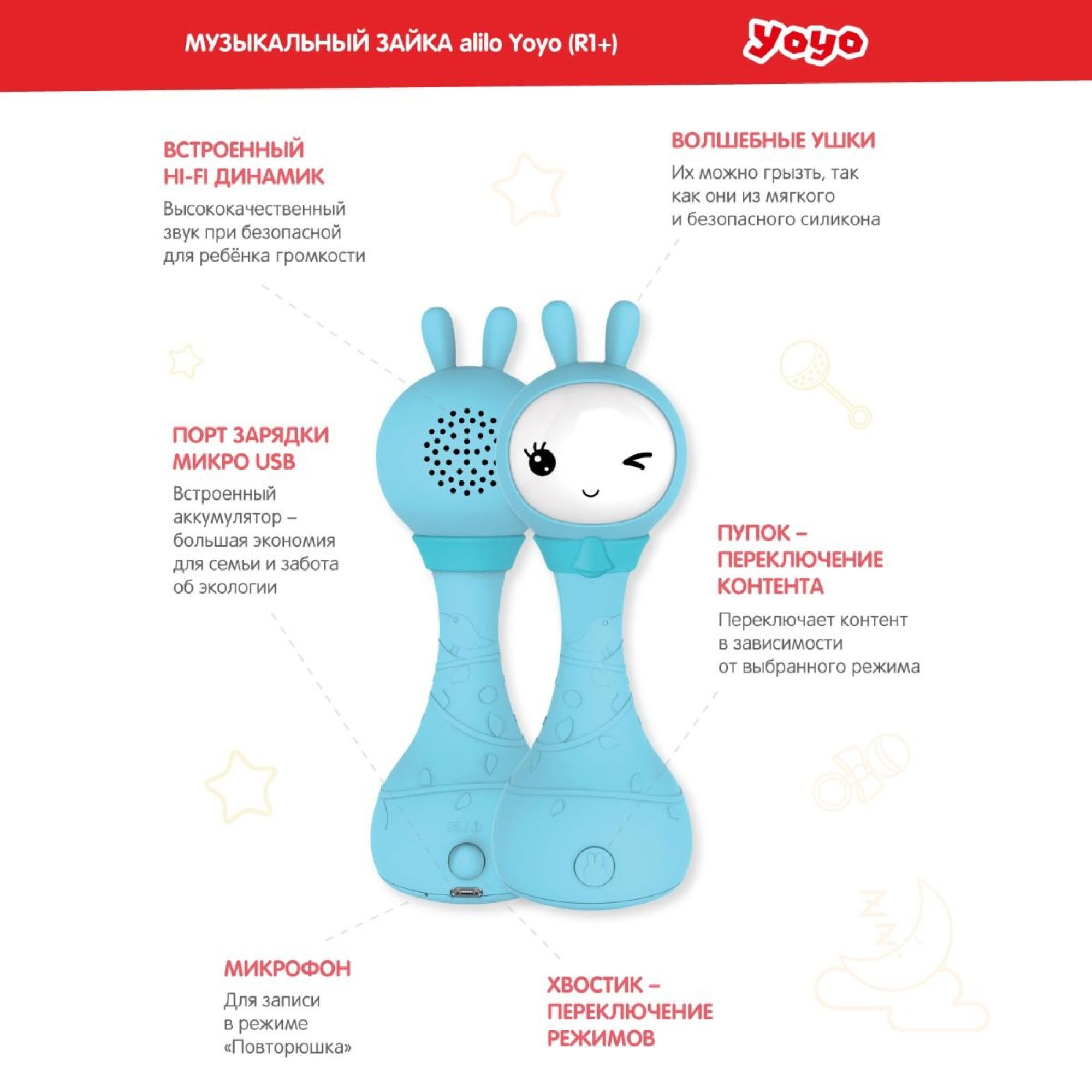 Зайка-няня Алило R1 YoYo поможет вам уложить малыша спать. Музыкальный зайка может играть успокаивающую классическую музыку и мягко светить ушами, когда приходит время ити в кроватку.