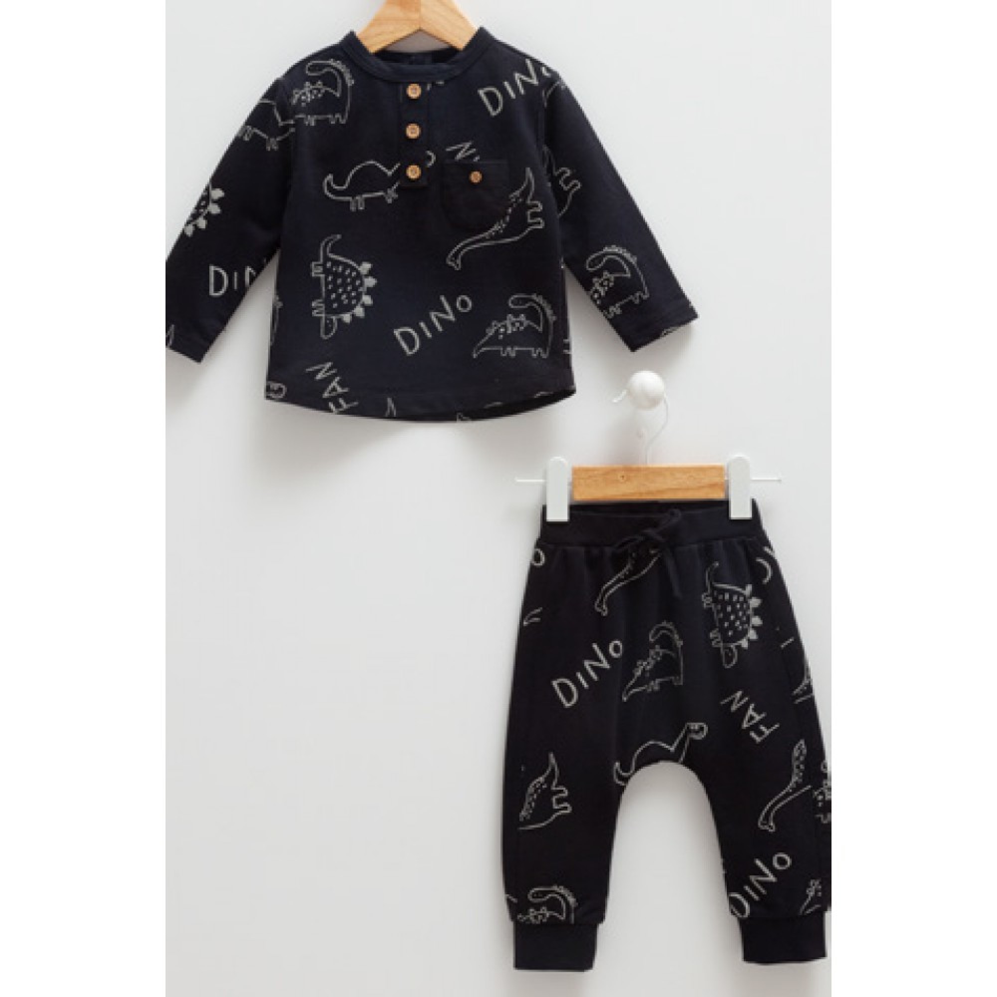 Набор состоит из свитшота и штанов. Свитшот с длинными рукавами, штаны на резинке. Черного цвета c рисунками динозавров.
