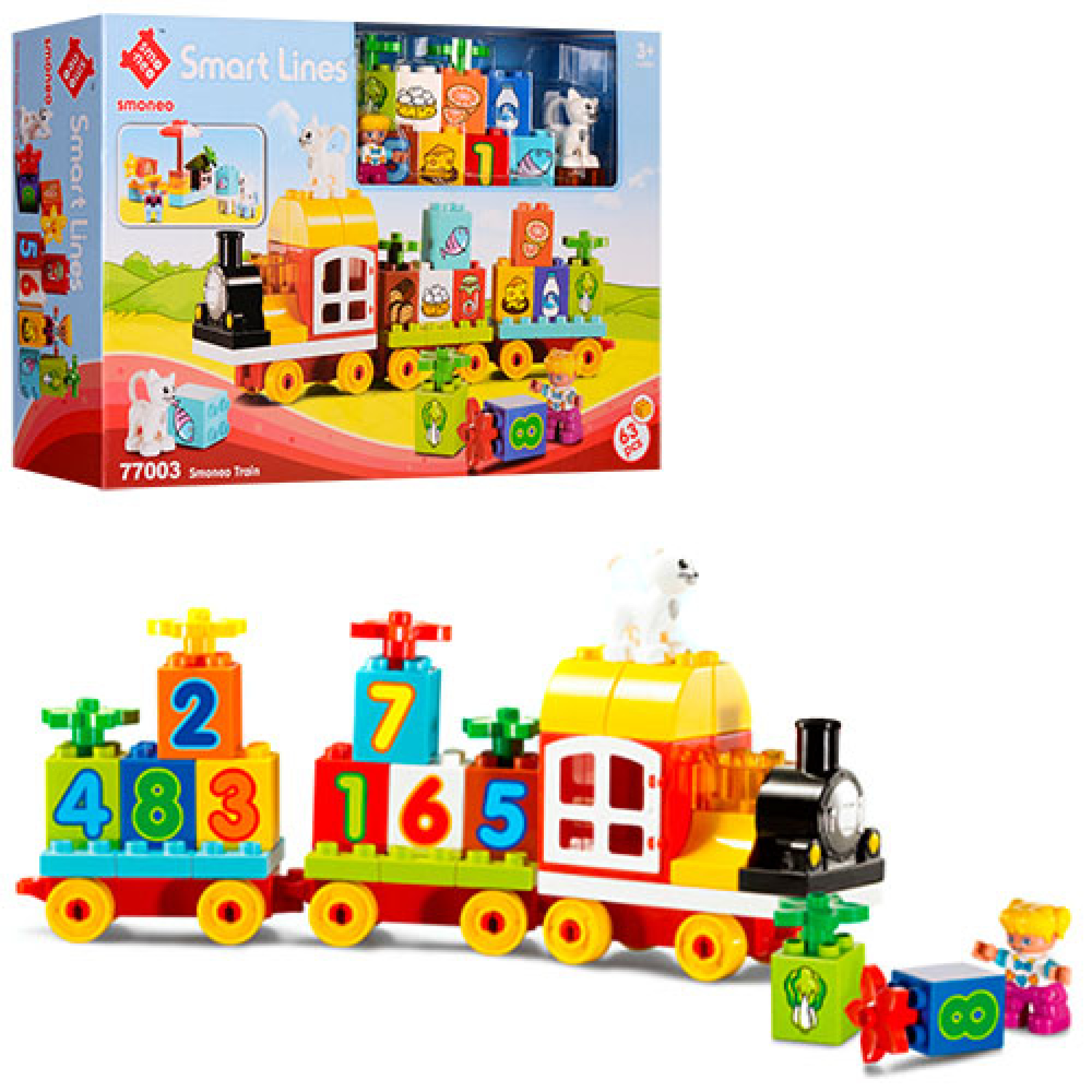Конструктор (77003) - обучит ребенка цифрам. Состоит из паровозика, фигурок, всего 63 детали. Размер коробки: 45х30х10 см.