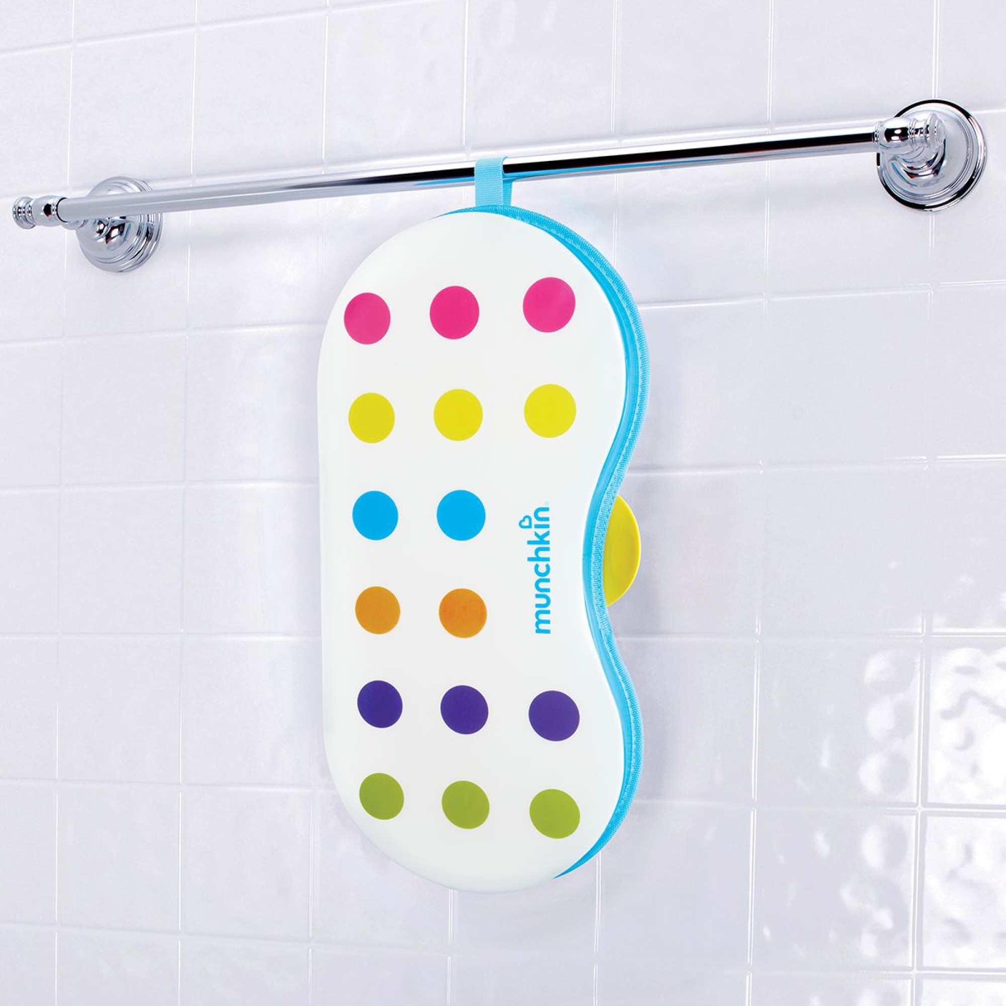 Коврик Munchkin "Bath Kneeler" размещается возле ванной для комфорта родителей во время купания малыша.