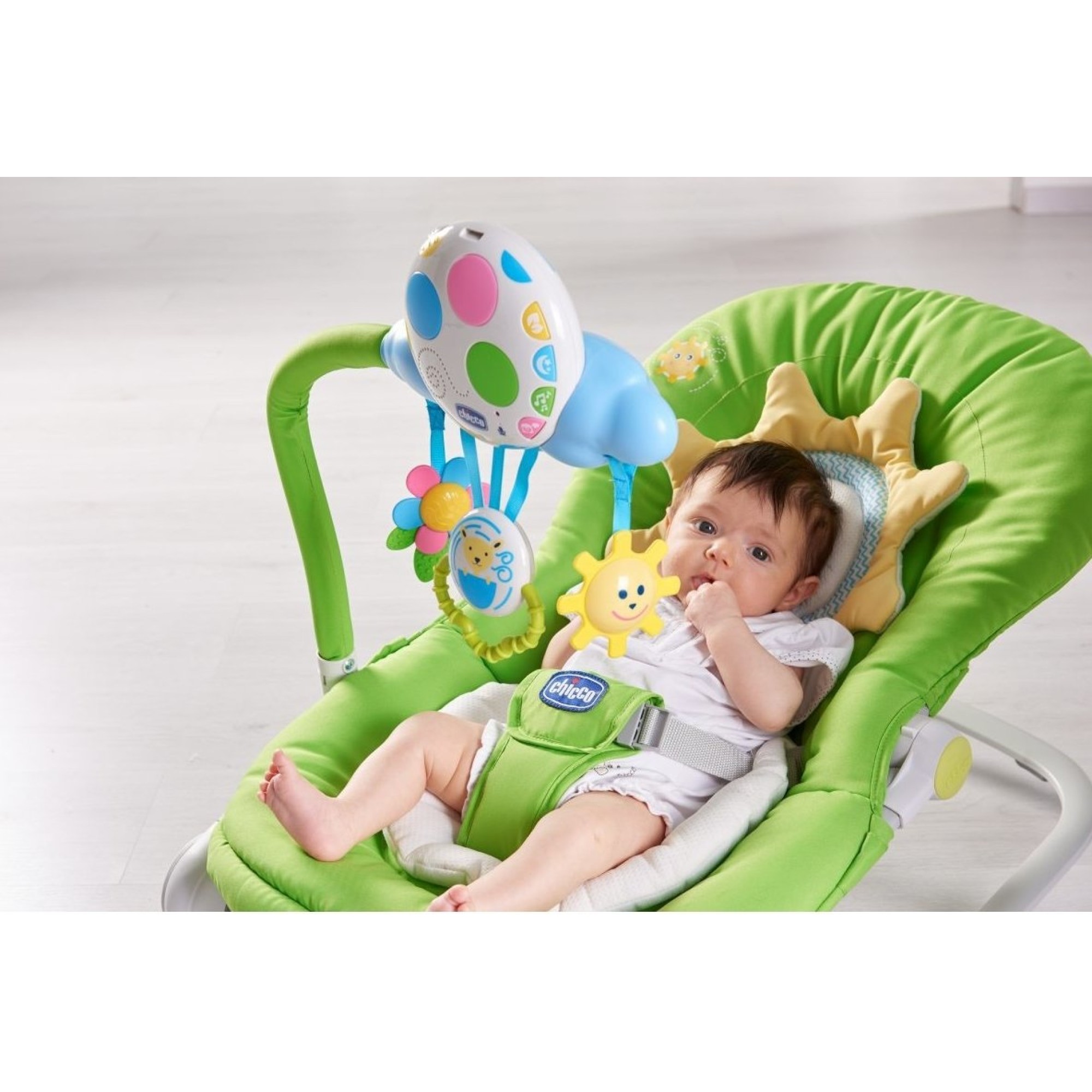 Веселить и развлекать ребенка в кресле-качалке Chicco Balloon будет игровая панель "Воздушный шар".