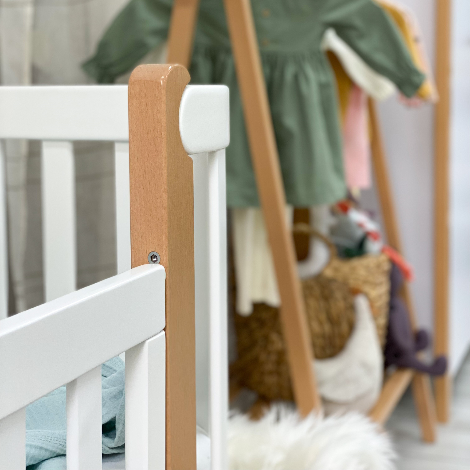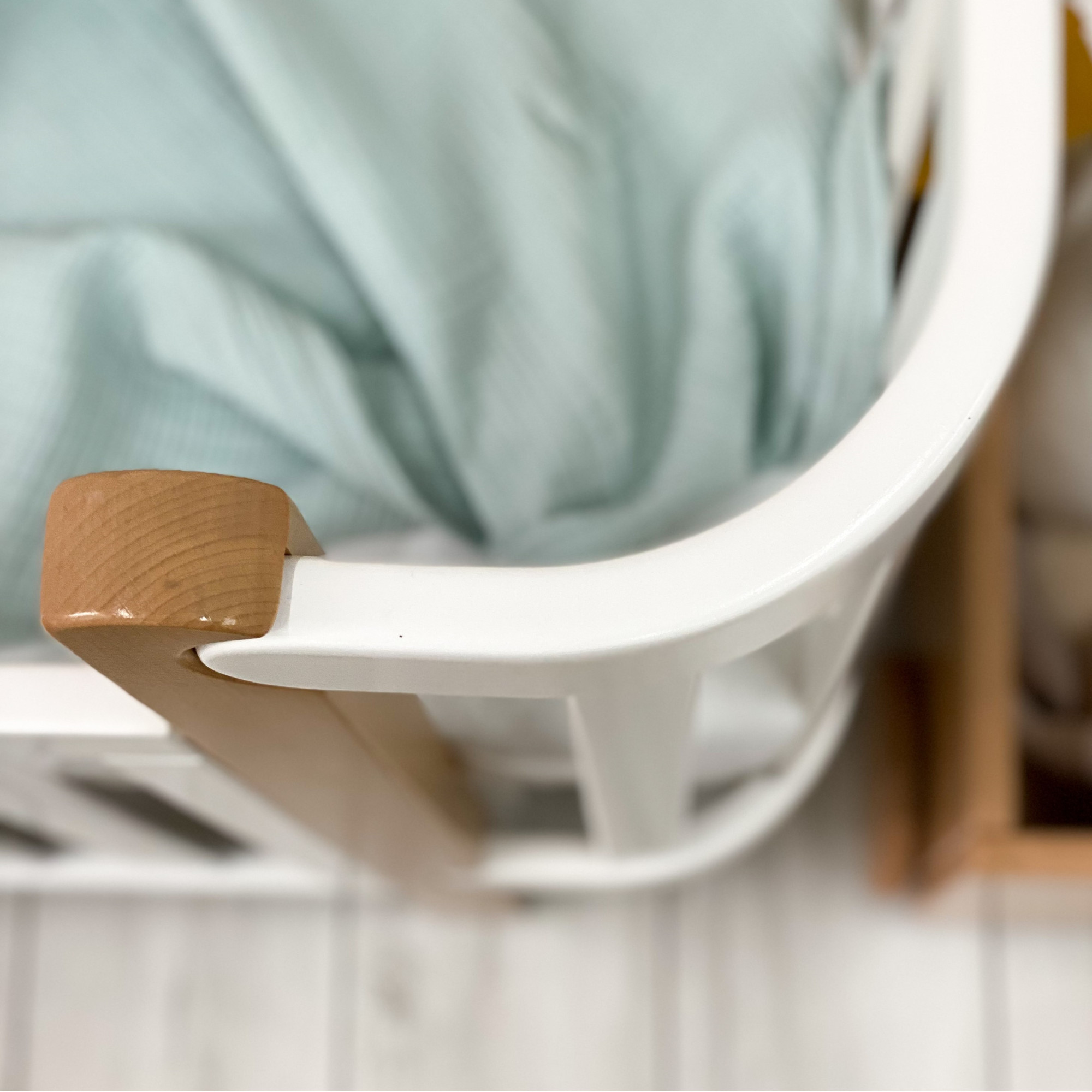 В производстве мебели Veres используется немецкая фурнитура Häfele. Monaco сделана в минималистичном стиле, поэтому даже когда опускается спинка, вы не видите никаких механизмов или направляющих, так как они скрыты снизу. Также все болты ввинчены на одном уровне с деревянными элементами и не выступают. Спинка имеет предохранитель, чтобы ребенок сам не смог её опустить.