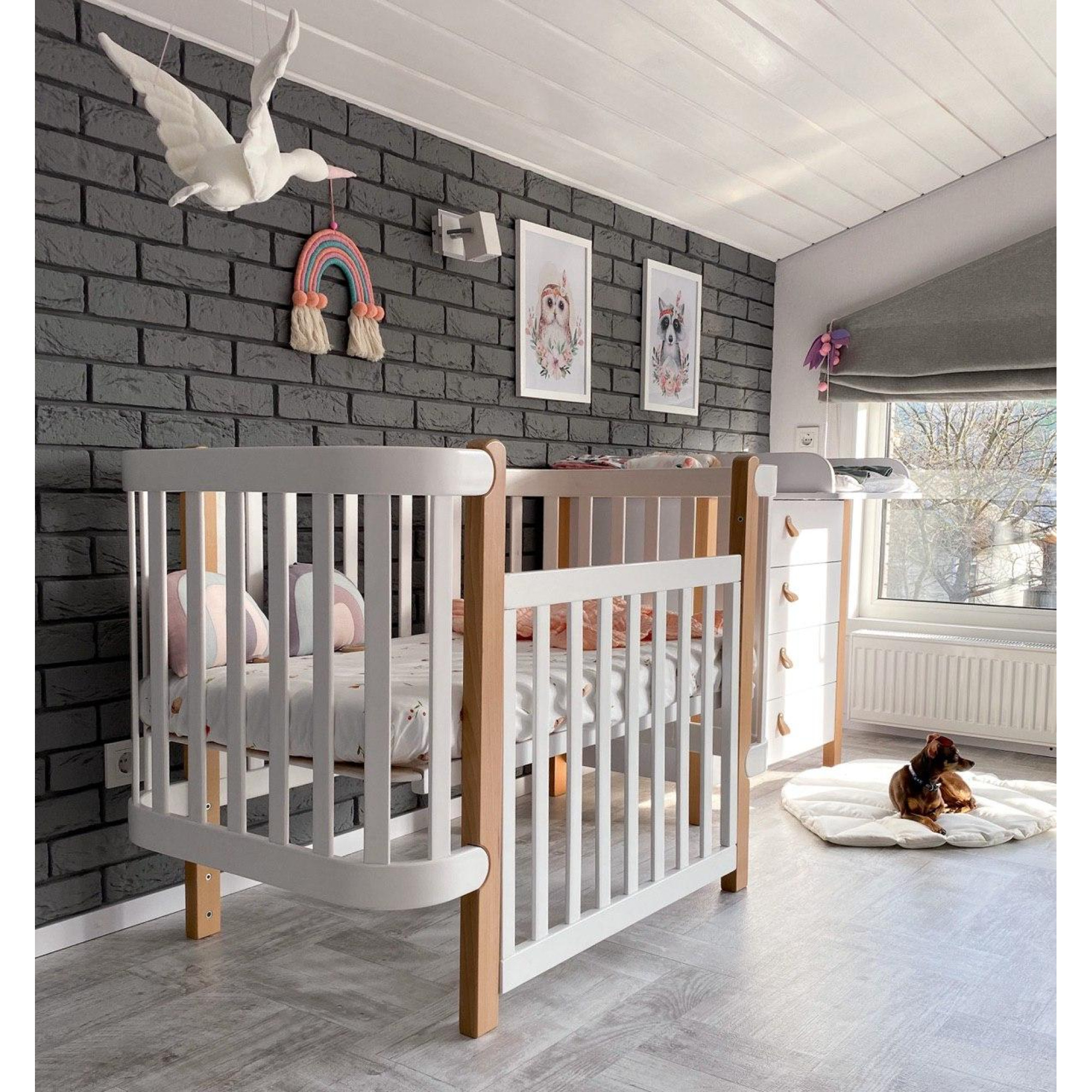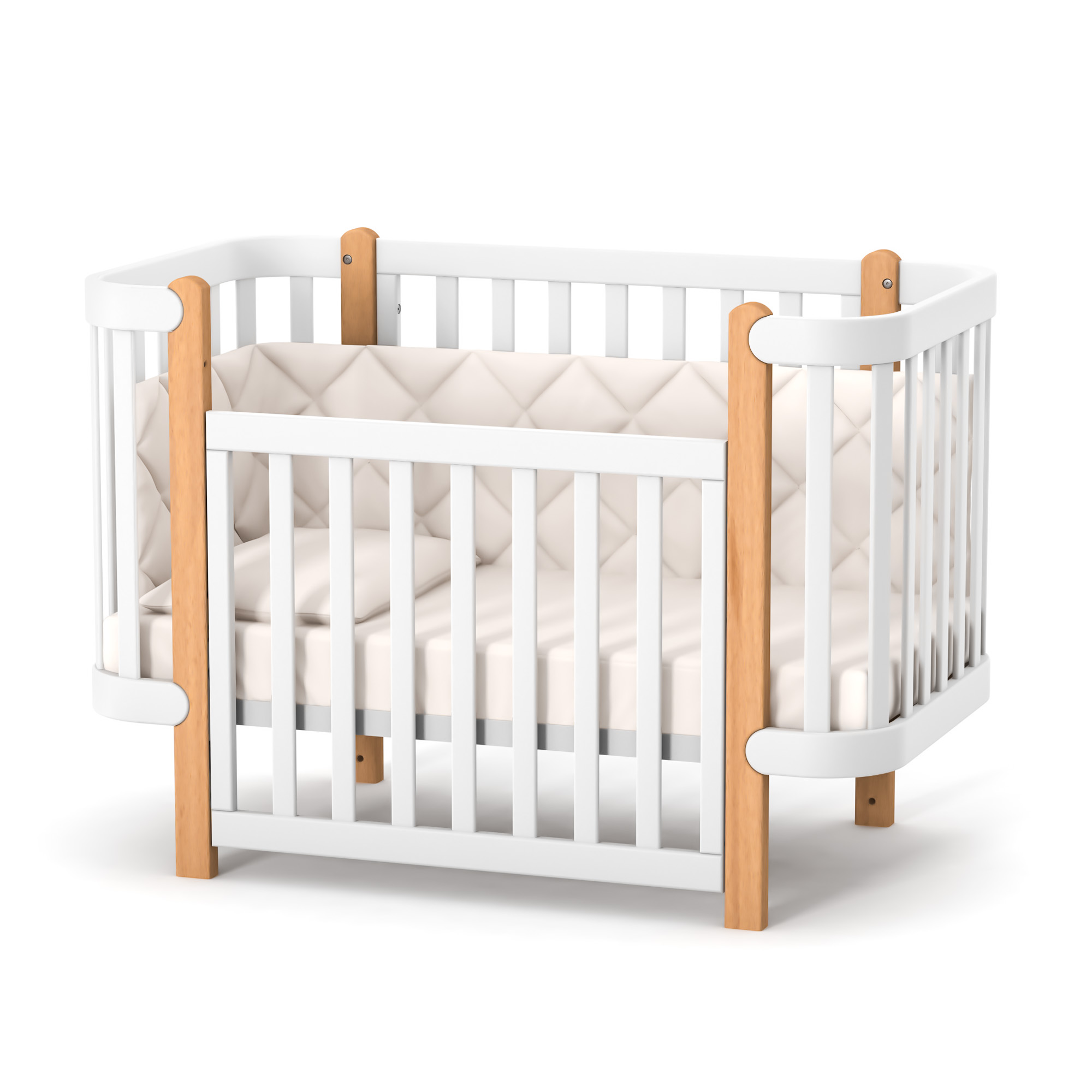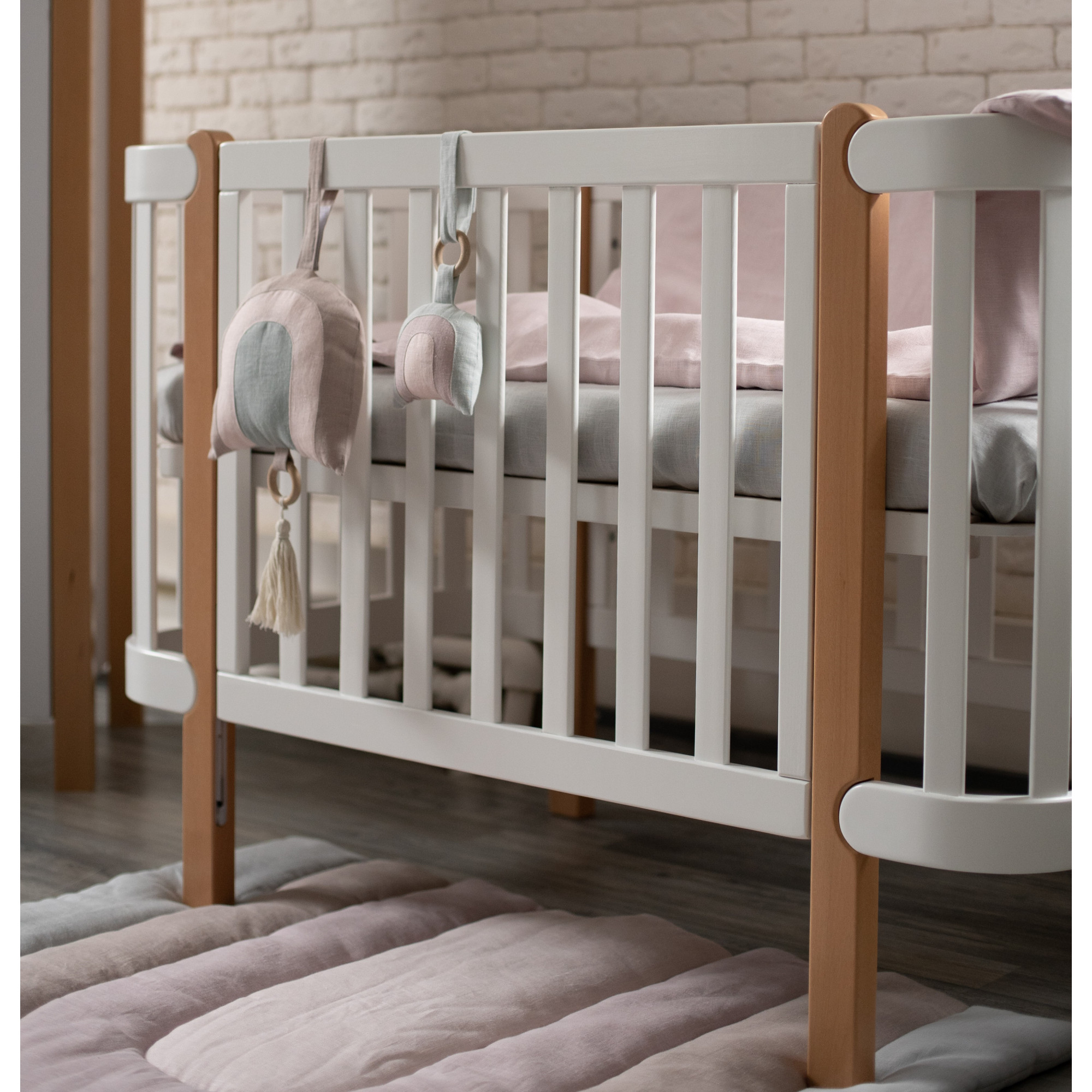 детская кроватка (120x60 см), бук, антибактериальная краска с ионами серебра, немецкая фурнитура, подвижная боковая стенка • White Natural | Бело-буковый