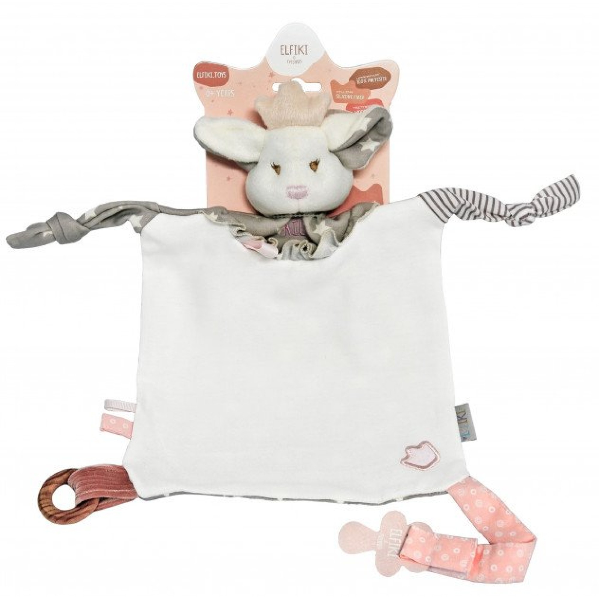 Это идеальная игрушка для засыпания, а также многофункциональная для первых игр малыша, которая побуждает к движениям, таким образом способствует развитию тактильных ощущений и мелкой моторики. Деревянное кольцо из высококачественного бука удобно держать в маленькой ручке, также оно прекрасно выполняет функцию прорезывателя. Держатель для пустышки является незаменим в повседневном уходе за малышом. Комфортер - идеальная игрушка для самых маленьких детей, польза в том, что она создает благоприятную атмосферу для засыпания новорожденного малыша. Рекомендуется положить игрушку-комфортер вблизи ребенка, когда он засыпает, а также во время кормления. Ткань хорошо впитывает запах мамы и малышу комфортно в кроватке или коляске, ведь родной запах мамы рядом. Изготовлена из приятного на ощупь материала, поэтому следить за чистотой текстильной игрушки не сложно - ее легко стирать и сушить.