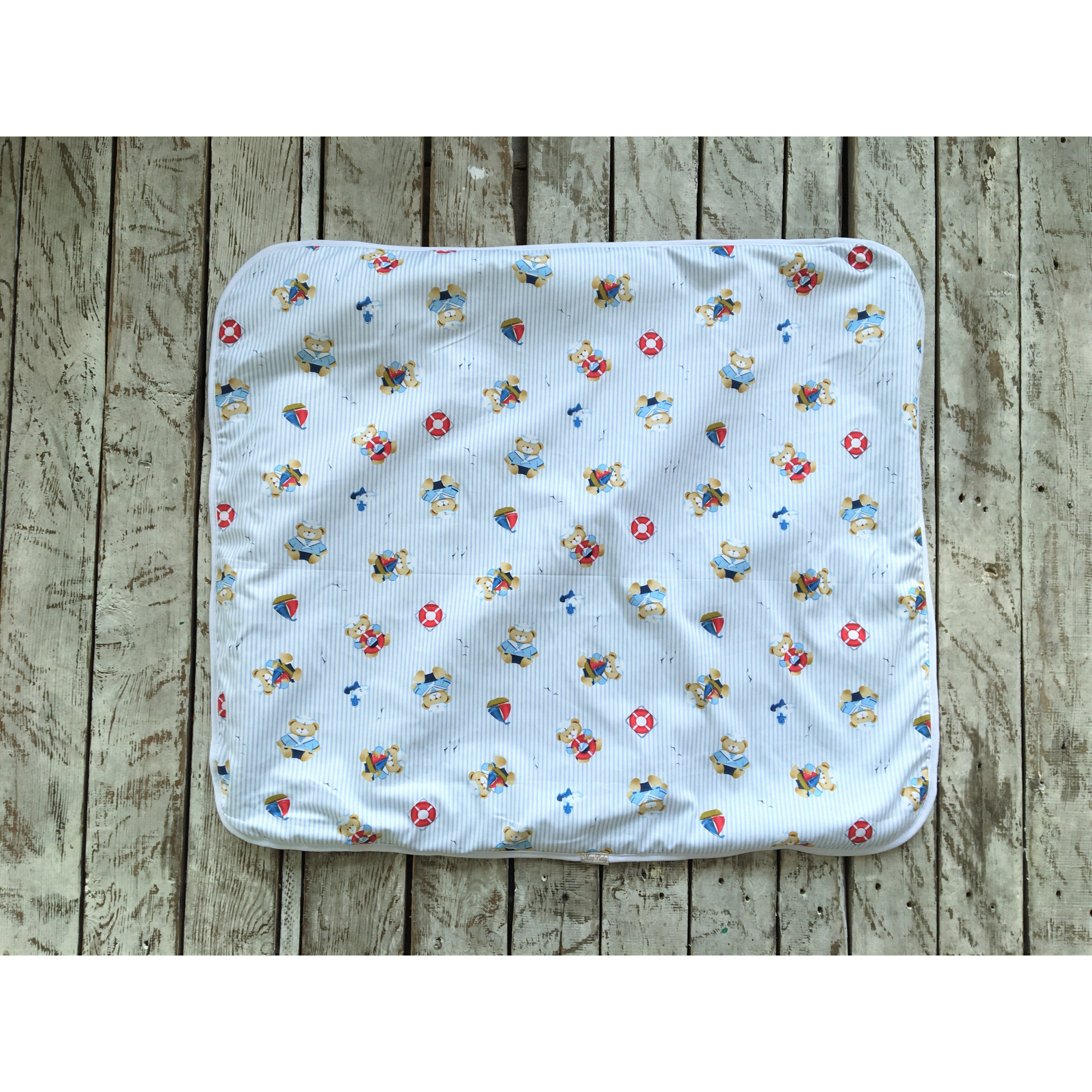 Пеленка выполнена из непромокаемой трикотажной махры, тонкого слоя поролона и сатиновой ткани (100% хлопок).