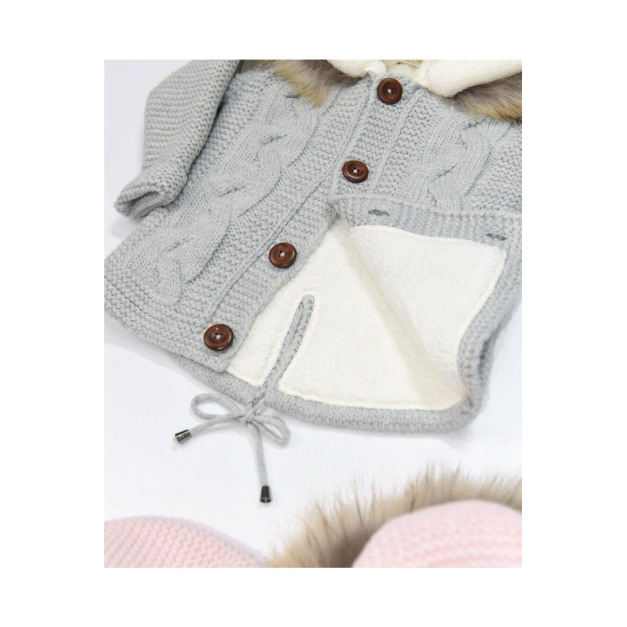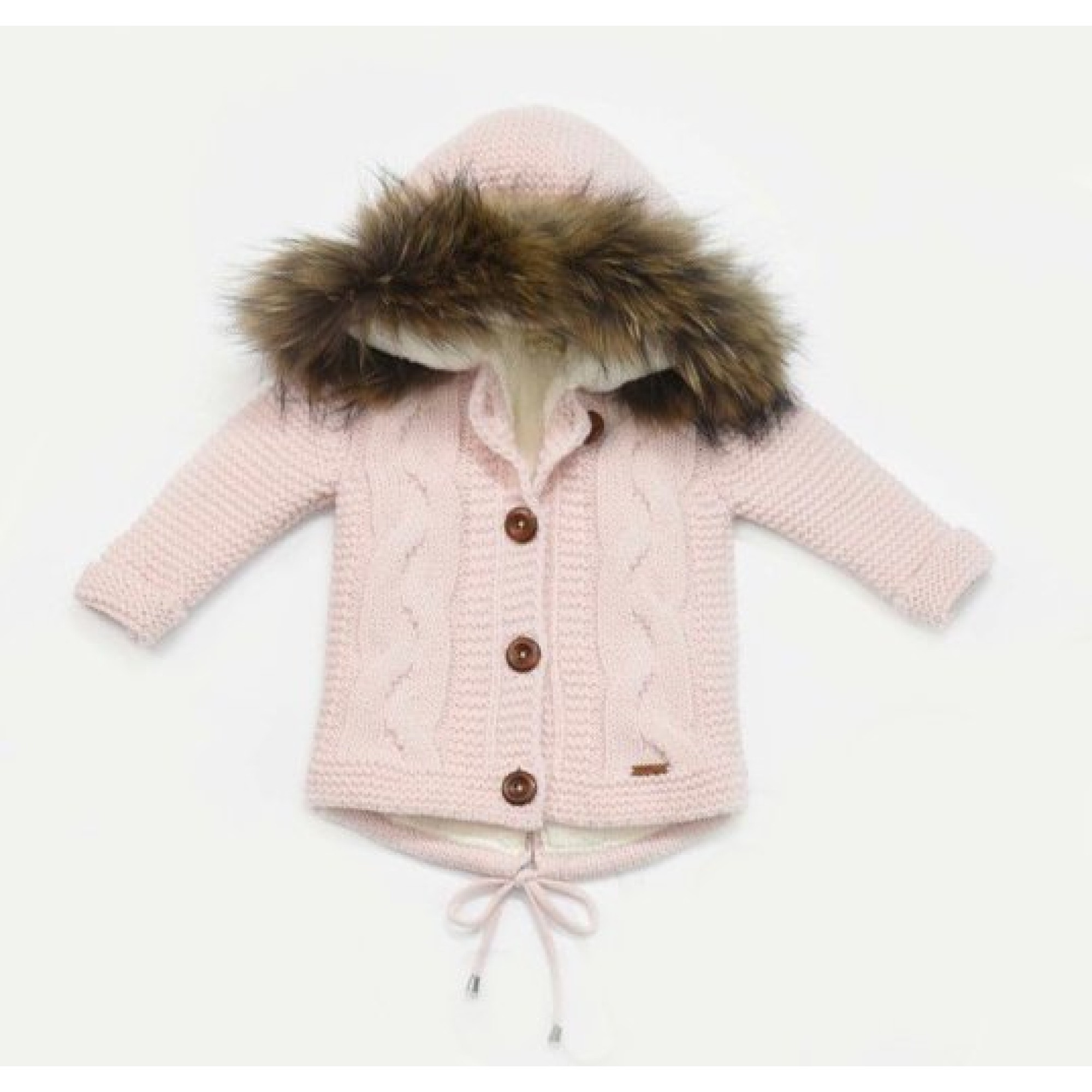 В составе шерсть мериноса, внутри мягкая тёплая подкладка. На капюшоне мех, который легко отстёгивается.