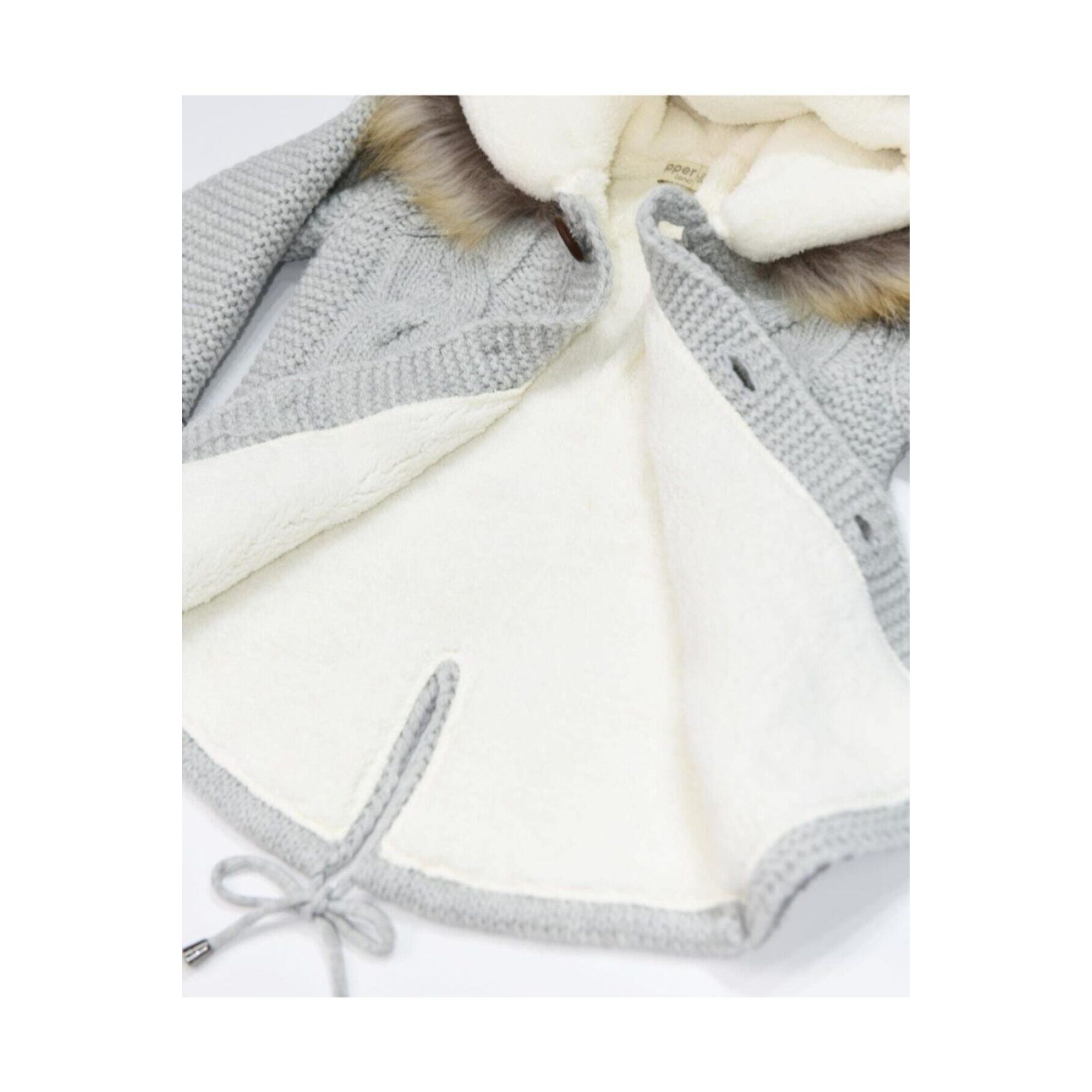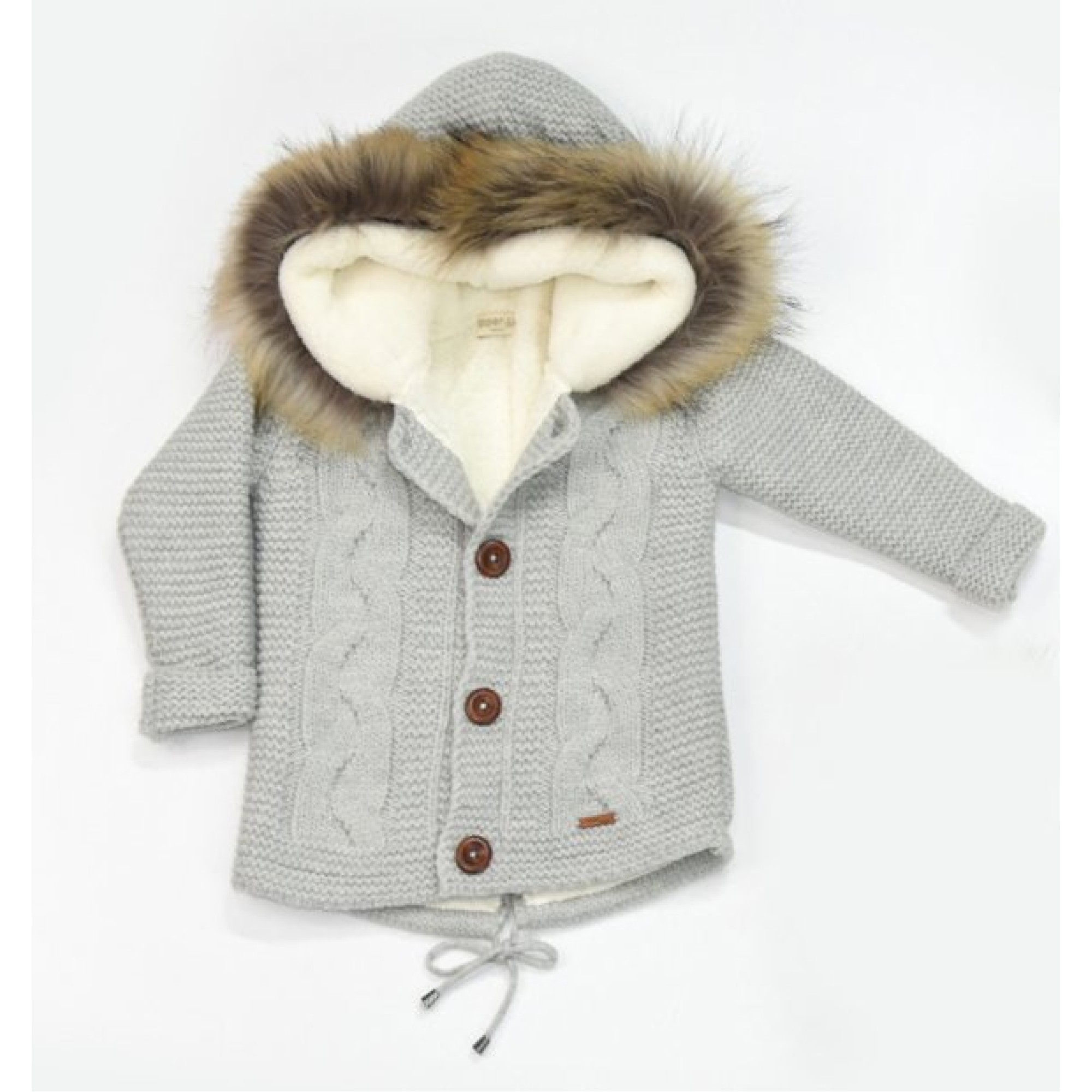 В составе шерсть мериноса, внутри мягкая тёплая подкладка. На капюшоне мех, который легко отстёгивается.