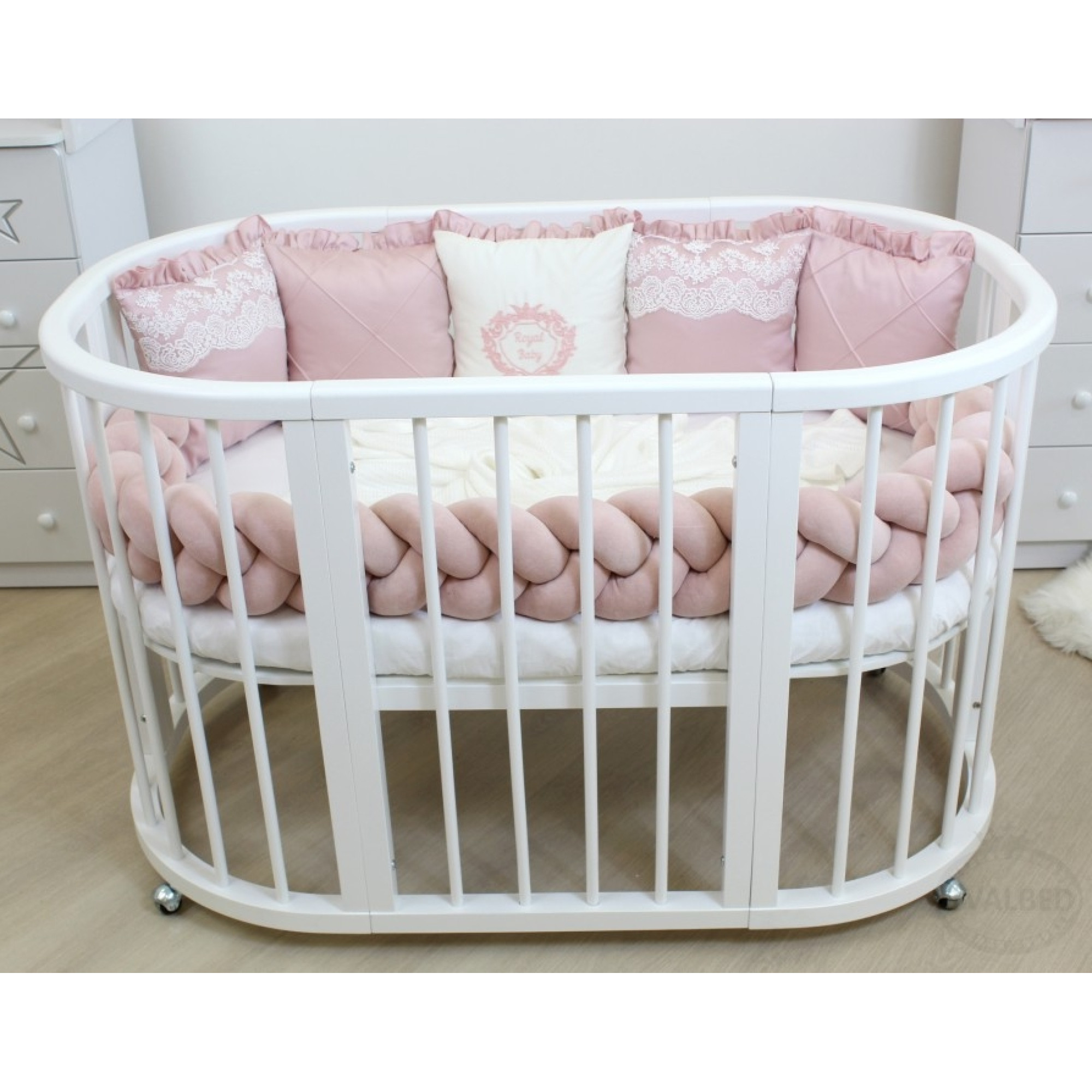 Круглую люльку Ovalbed можно передвигать с помощью мягких колес. Специальные полозья превращают кровать в колыбельку. Те же действия применимы и к увеличенной овальной кроваткой.