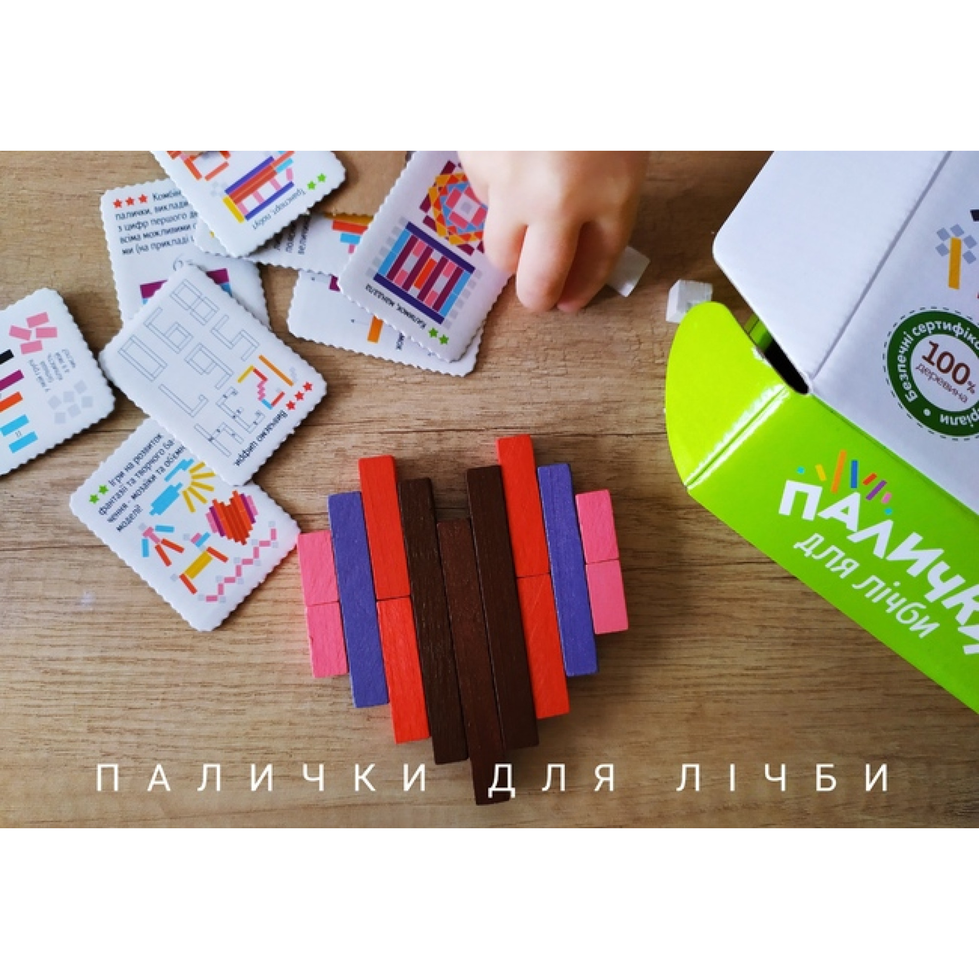 Набор состоит из 56 деревянных палочек 10-ти разных цветов, с сечением 10х10 мм, которые отличаются длиной и цветом.