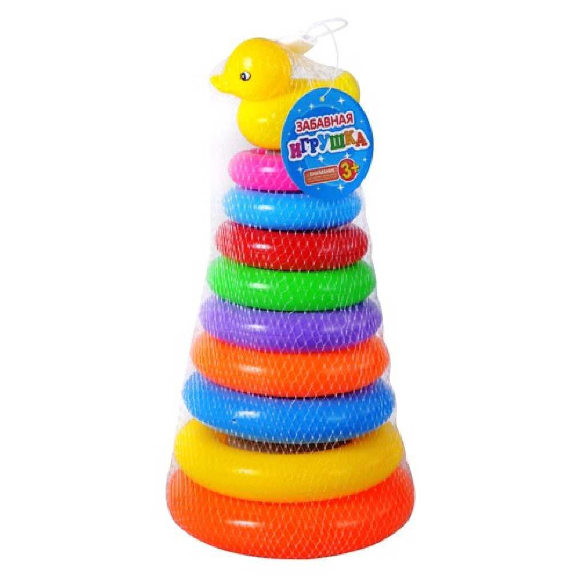 Разноцветная пирамидка размером 30 см, изготовлена из пластмассы.