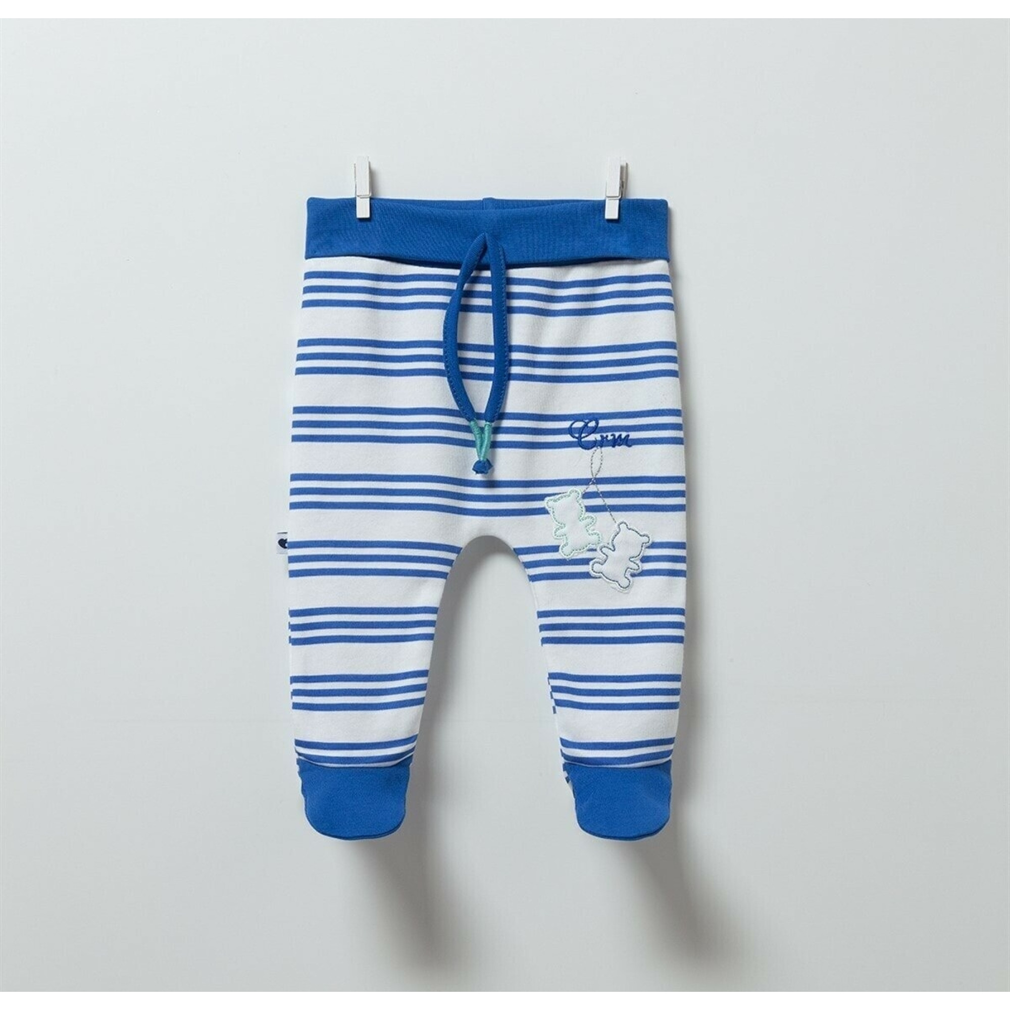 Ползунки синего цвета в белую полоску подойдет новорожденным деткам, мальчику.