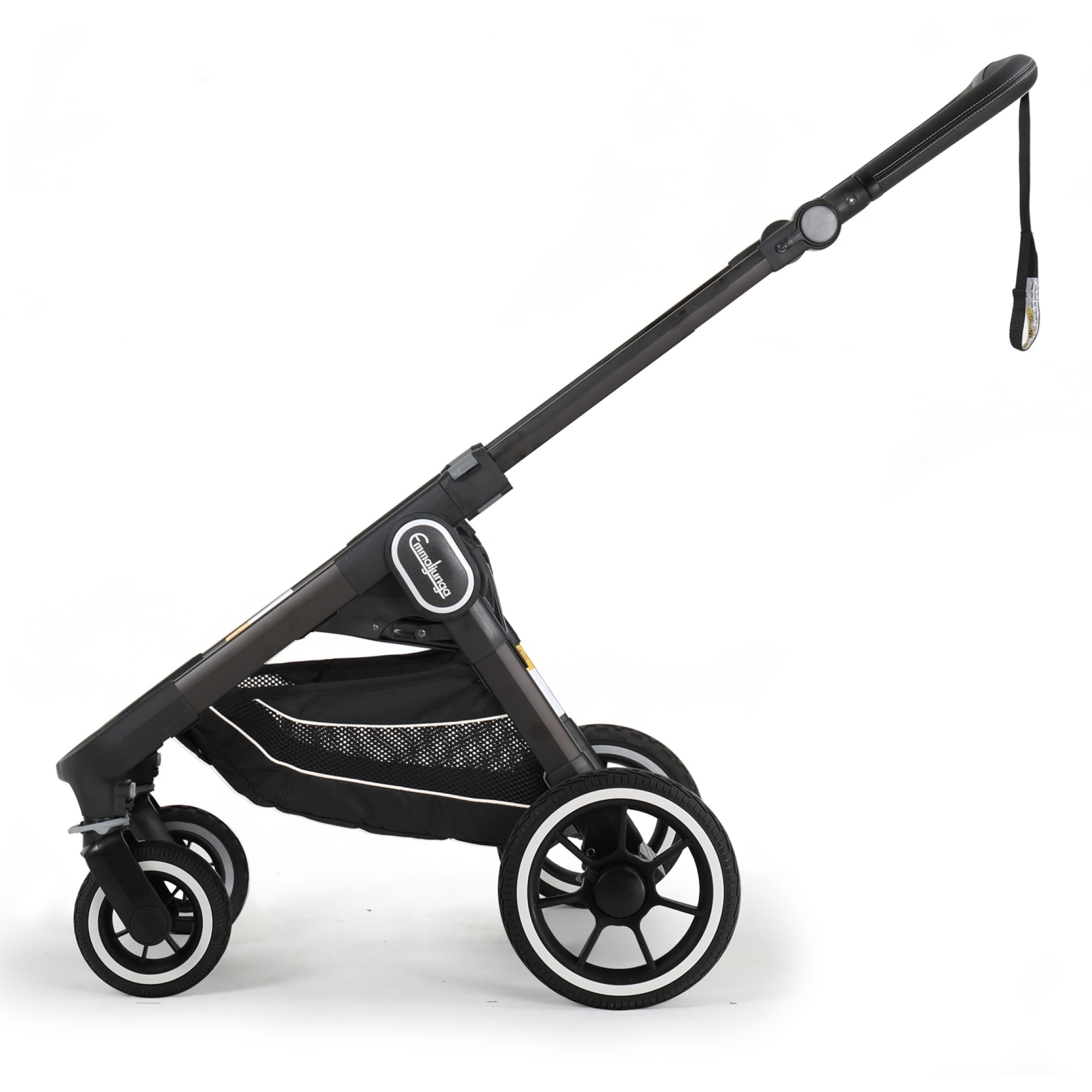 Шасси Emmaljunga NXT60 Black - имеют облегченные классические бескамерные колеса и перфорированную экокожу с контрастной строчкой на ручке коляски.