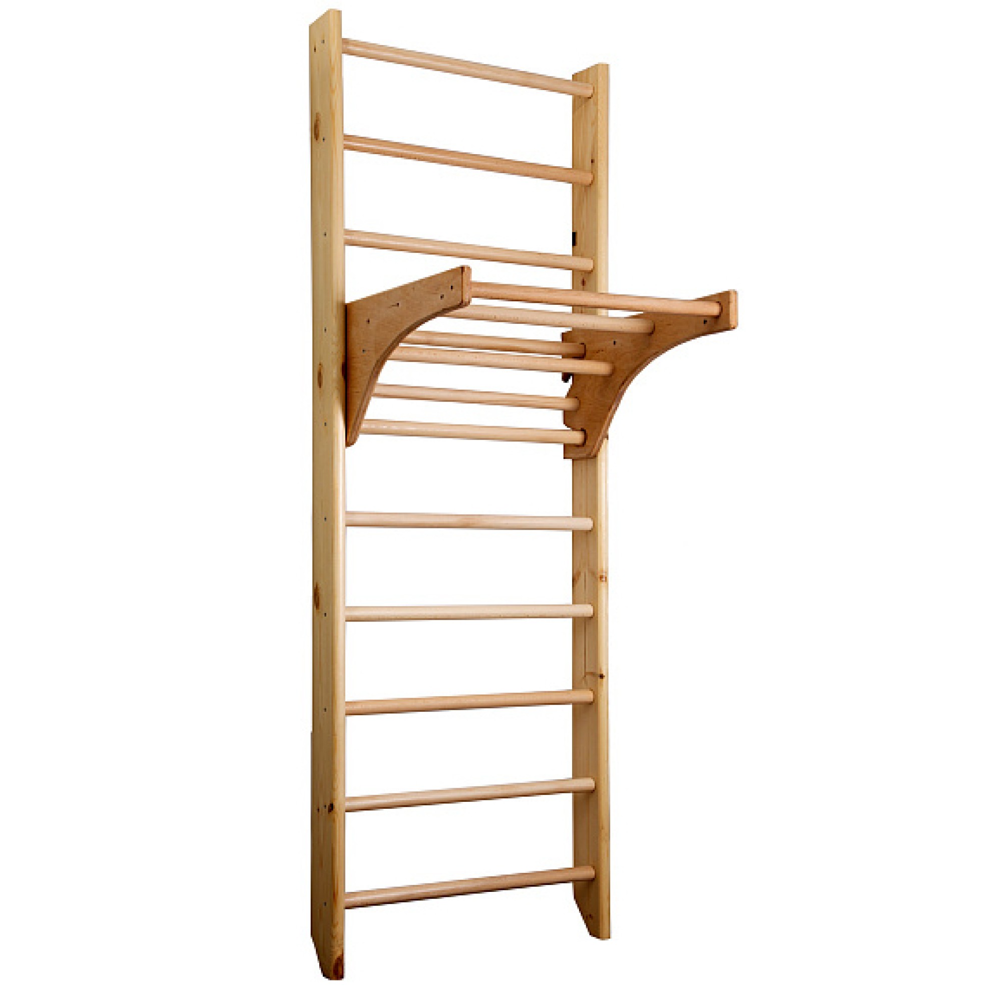 В основе стенки лежит сосна, перекладины сделаны из бука, а турник – из фанеры. Турник имеет очень прочную конструкцию, несмотря на возможность передвижения, он выдерживает большие нагрузки, что нравится многим покупателям.