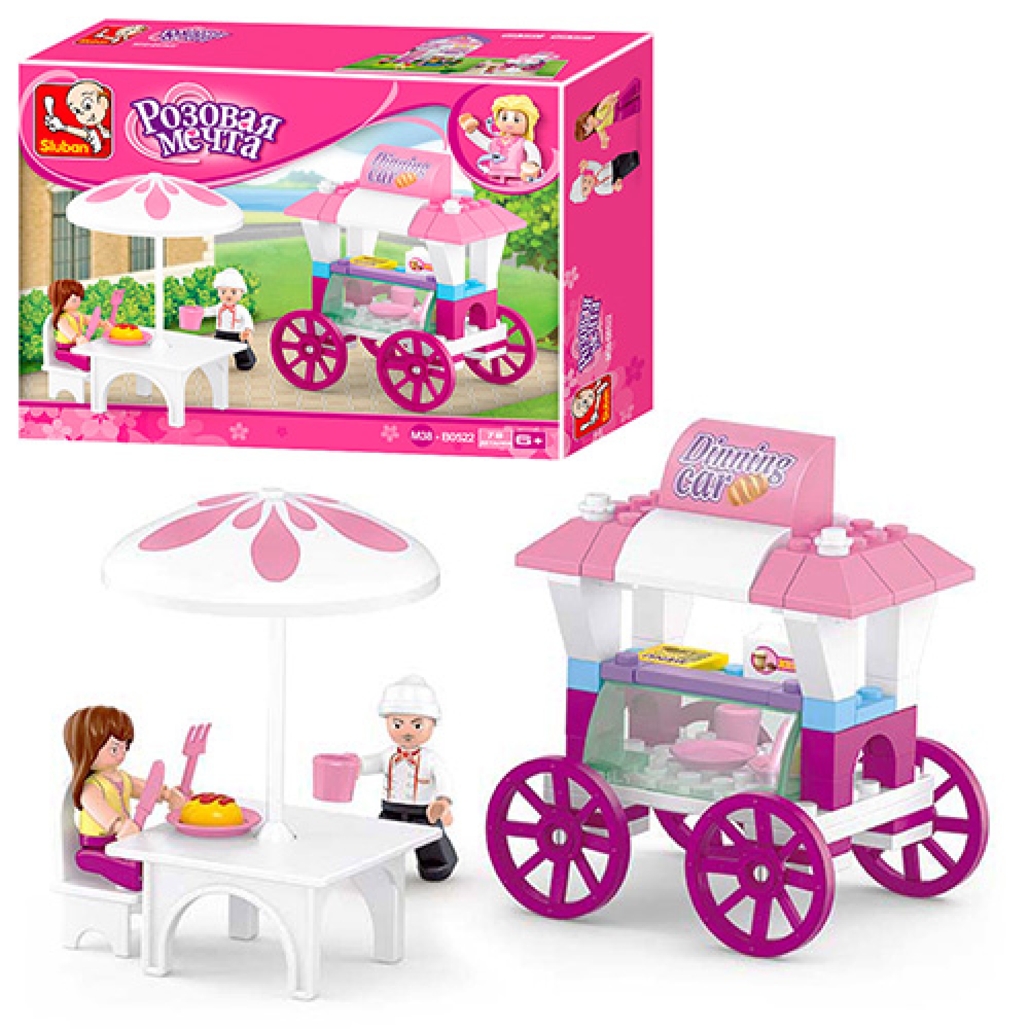 Конструктор Sluban Кафе на колесах (M38-B0522) - содержит 2 фигурки, столик. Состоит из 78 деталей. Размер коробки: 19х14х4,5 см.