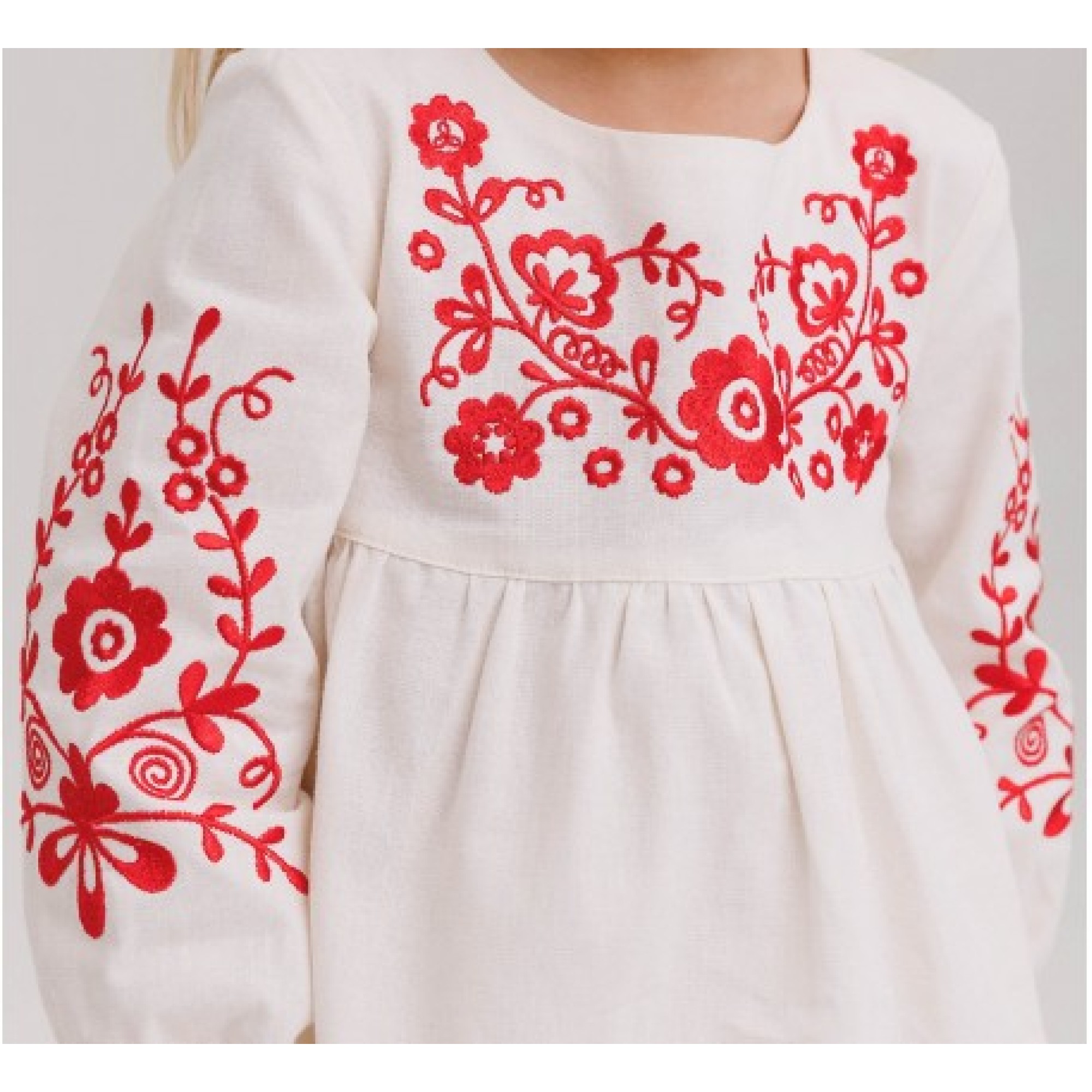 Платье прямого силуэта, отрезное по талии, расширенное к низу. Цвет — молочный. Перед и рукава украшены вышивкой. Рукав вшивной, длинный, по низу собран на резинку. Горловина обработана обшивкой. На спинке центральная застежка на кнопки.
