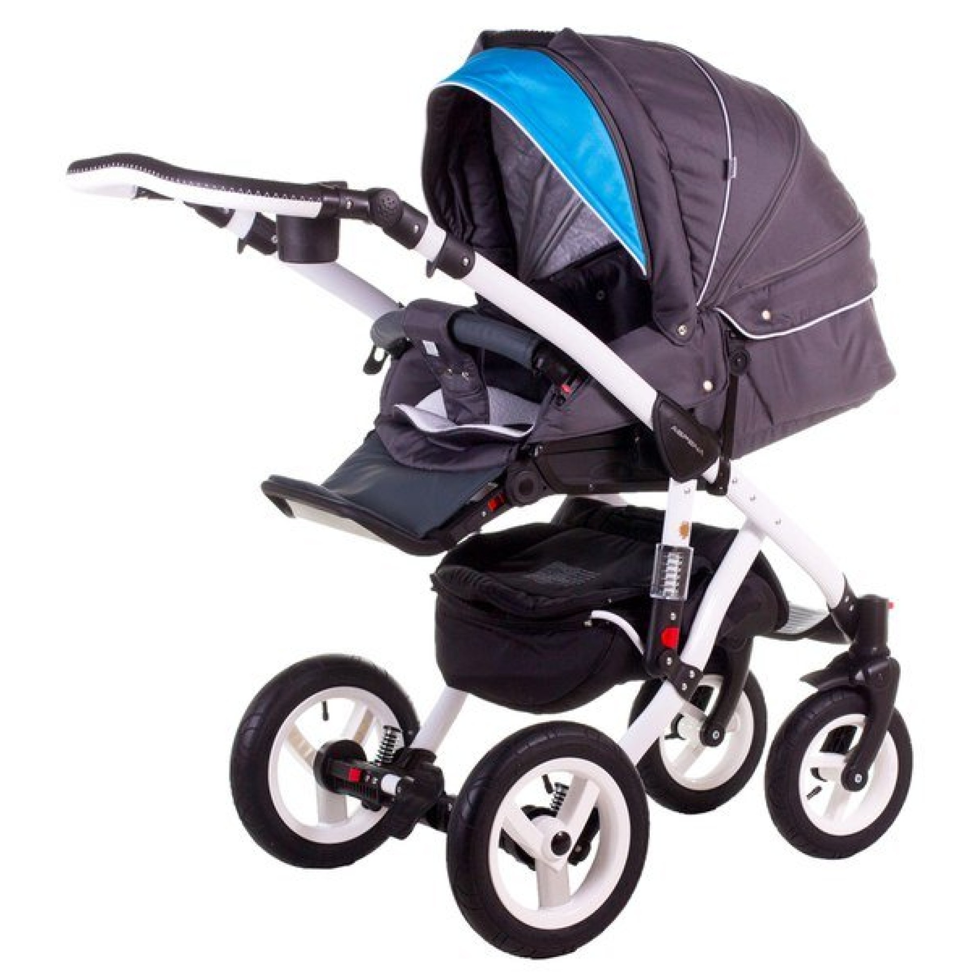 Именно с ней вы получите все преимущества в одной модели. Легкая и крепкая рама, притягательная изяществом и белизной, идеальный баланс всей конструкции, который вы сразу же ощутите на дороге, двойная амортизация, благодаря которой нивелируется прохождение плохих участков дорог. Подвесная закрытая корзина под колясочным блоком расположена высоко - она не будет цепляться о бордюры и ступеньки. Колеса легкие, но устойчивые - наделяют коляску хорошей проходимостью. Колеса легко моются, просто снимаются и устанавливаются. Поворотность передней пары дарит маневренность, которая выручит вас в условиях, затрудняющих передвижение - между магазинными полками, в тесных помещениях, в людных местах. Вращение переднего шасси можно заблокировать, просто нажав на кнопки над каждым колесом. Родителям придется по душе облегченная, алюминиевая рама и простой механизм ее складывания и закрепления блоков.