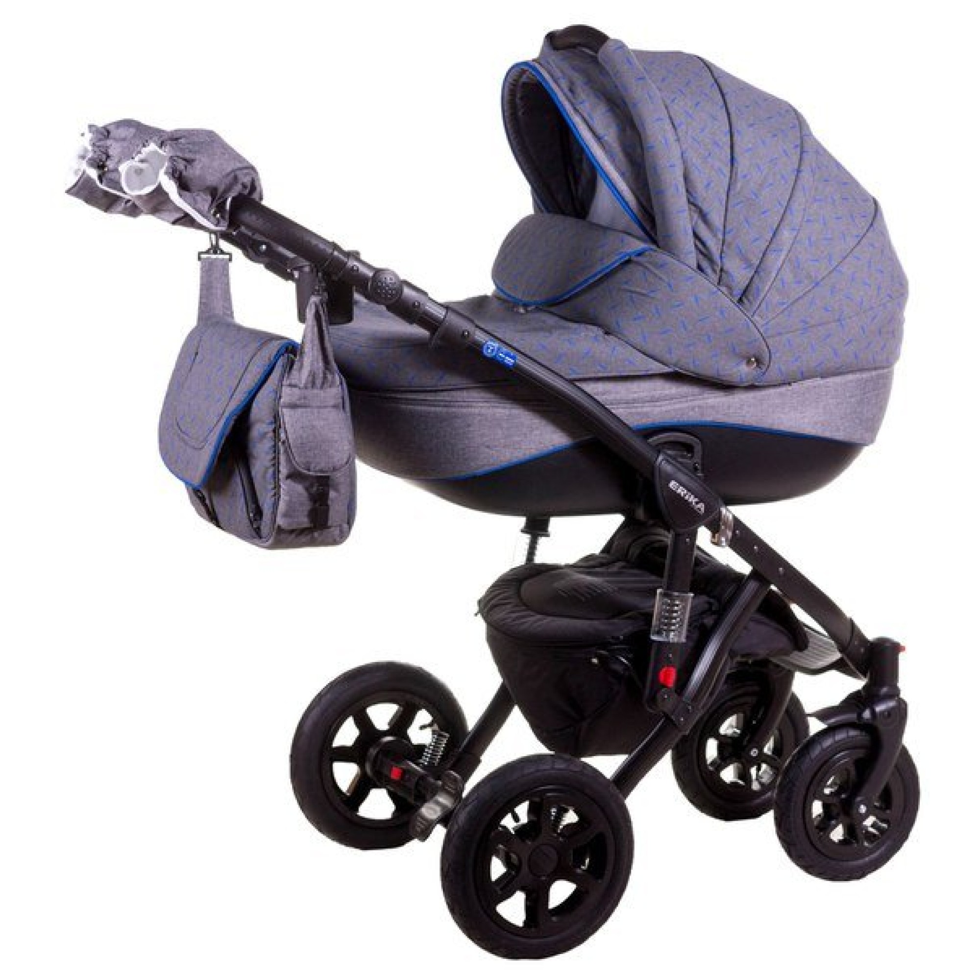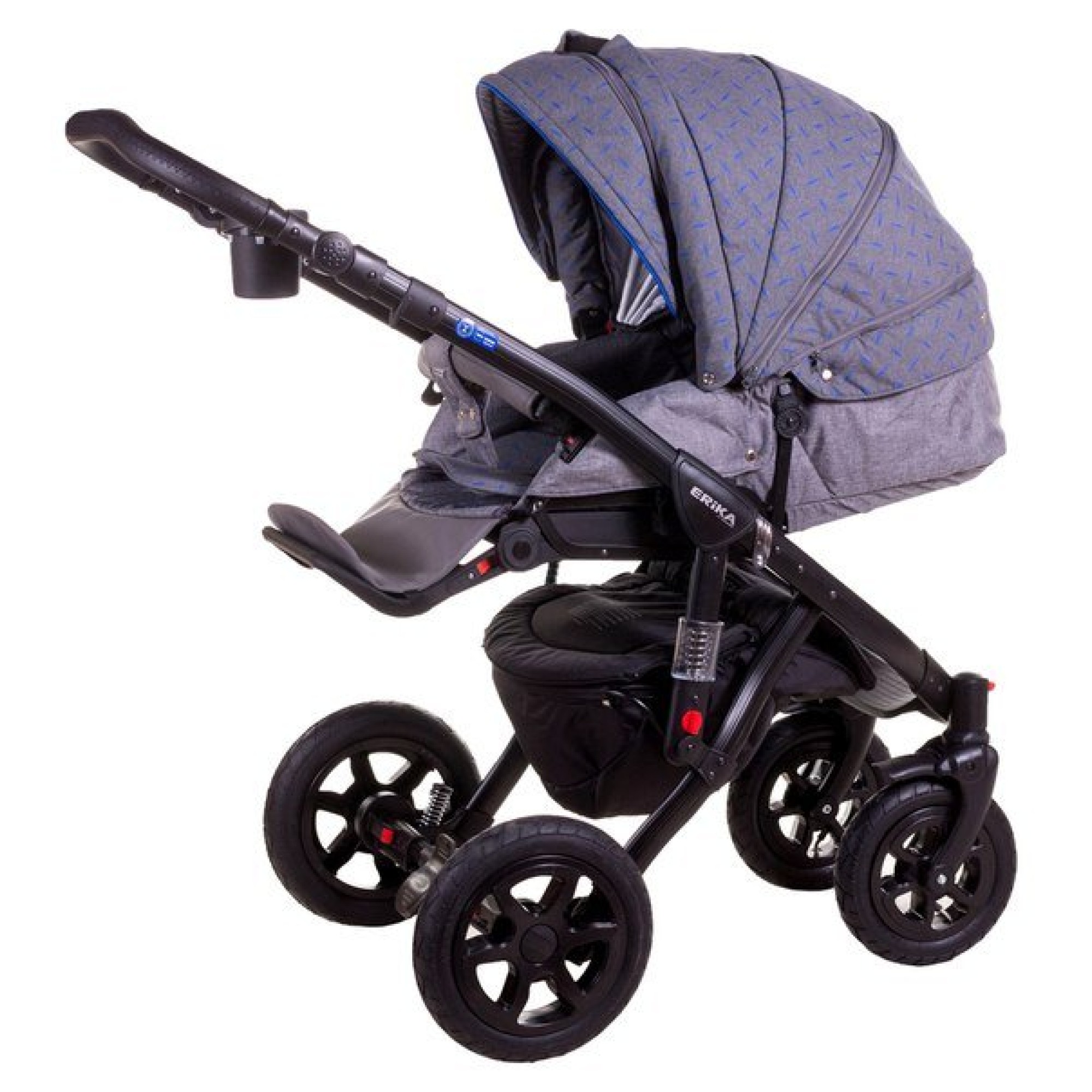 Adamex Erika може похвалитися полегшеною алюмінієвою рамою з плавними лініями по поверхні та інноваційною системою амортизації, які стали візитівкою Адамекс. У складеному стані рама займає небагато місця. Ручка батьків зазвичай обтягнута шкірою, підлаштовується під необхідне зростання.