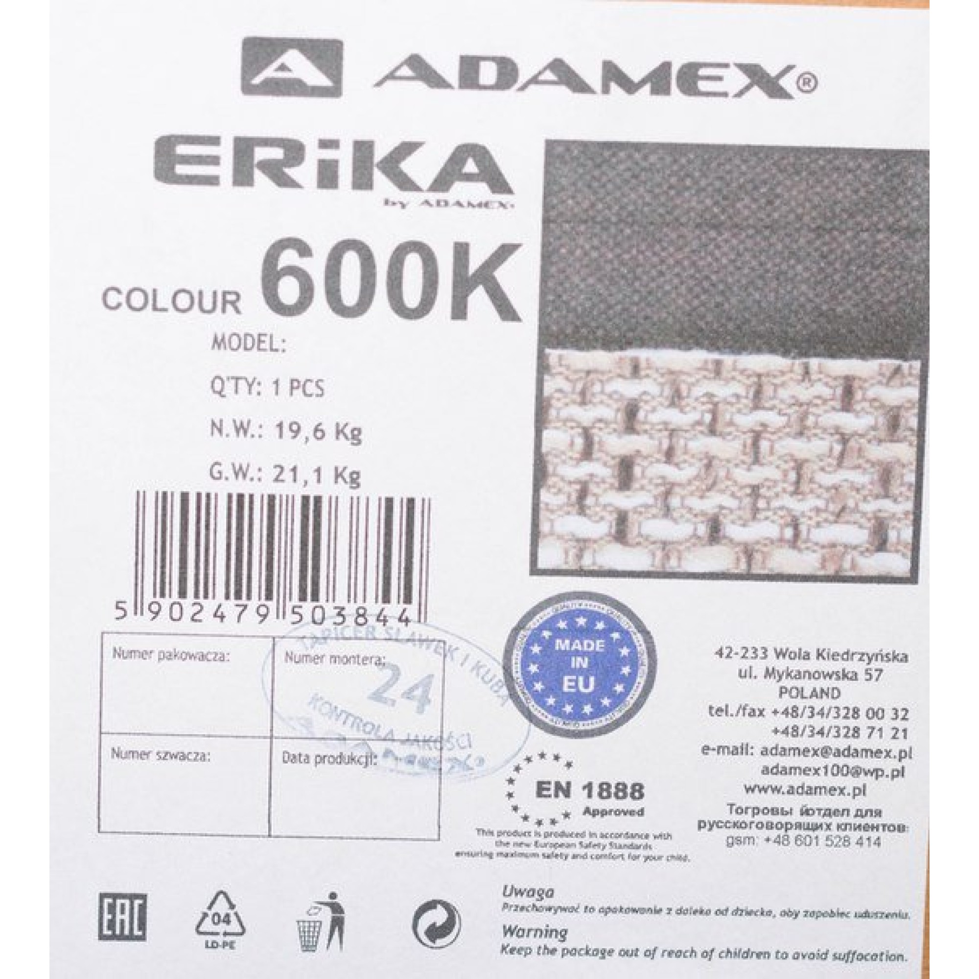 Adamex Erika може похвалитися полегшеною алюмінієвою рамою з плавними лініями по поверхні та інноваційною системою амортизації, які стали візитівкою Адамекс. У складеному стані рама займає небагато місця. Ручка батьків зазвичай обтягнута шкірою, підлаштовується під необхідне зростання.