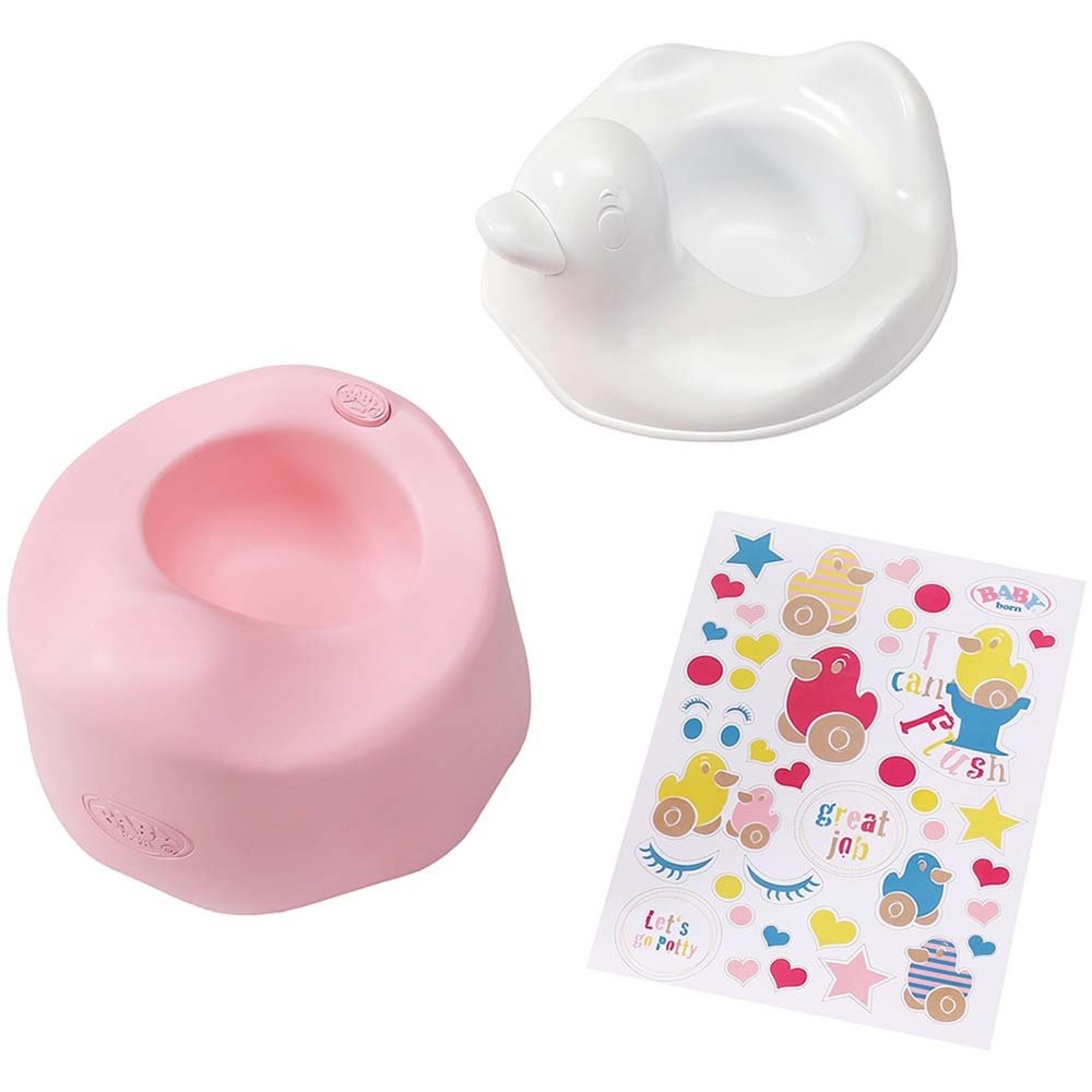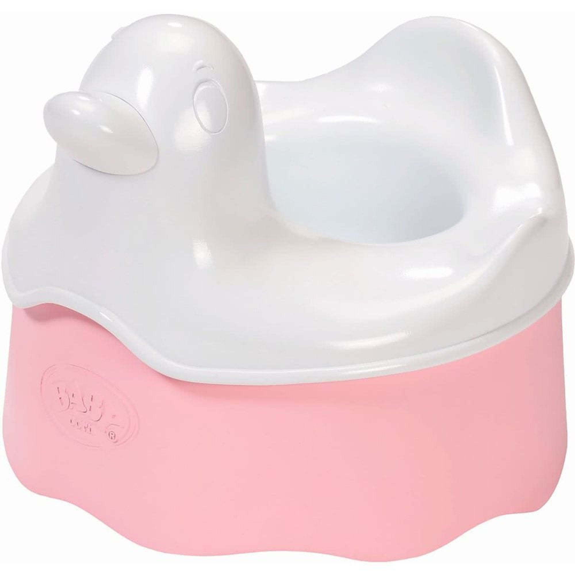 Він виготовлений у формі милої качки та складається з двох частин. Верхня біла частина дуже легко знімається і чиститься, а нижня рожева частина призначена для того, щоб маля прикрасило її красивими та яскравими наклейками. Як тільки лялька BABY BORN на нього сяде, то почне грати музика, а після завершення Ви почуєте бурхливі оплески.