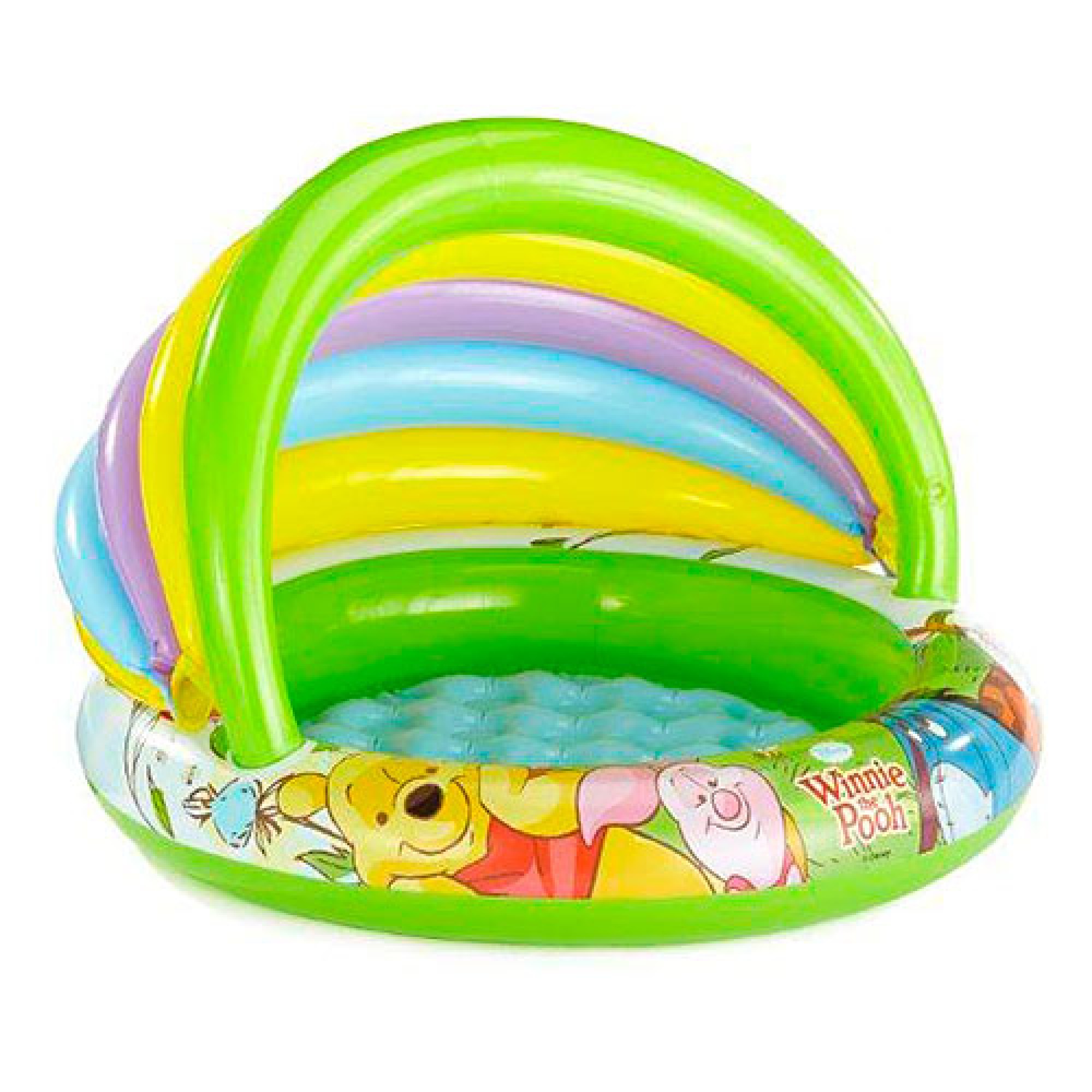 Надувний басейн-ігровий центр Вінні Пух з надувним дном та різнокольоровим навісом оформлений у стилі DISNEY та присвячений улюбленцю всіх дітей у світі – ведмежатку ВІННІ. Навіс захистить малюків від потрапляння прямих сонячних променів. Через низенькі борти зручно перелазити, а надувне дно забезпечить дитині повну безпеку.