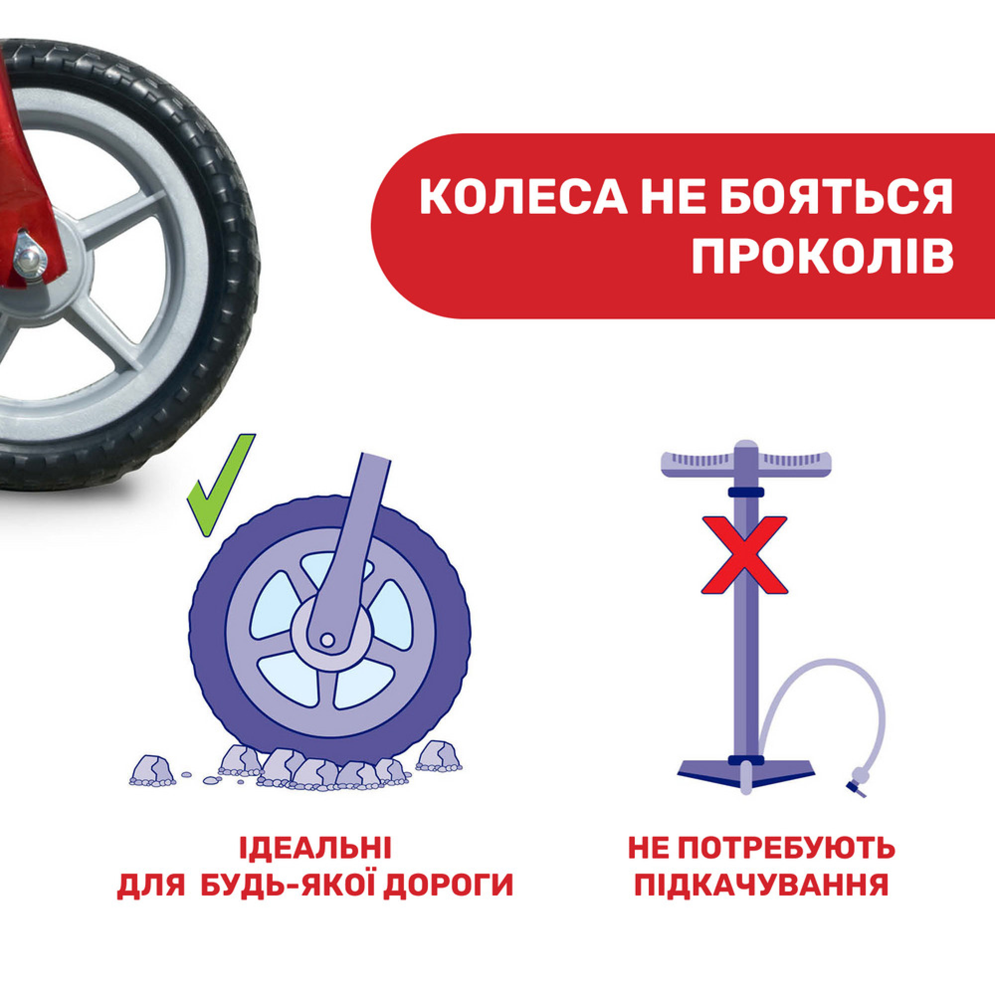 - колеса із захистом від проколів дозволяють їздити будь-якою місцевістю. Не потребують підкачування;