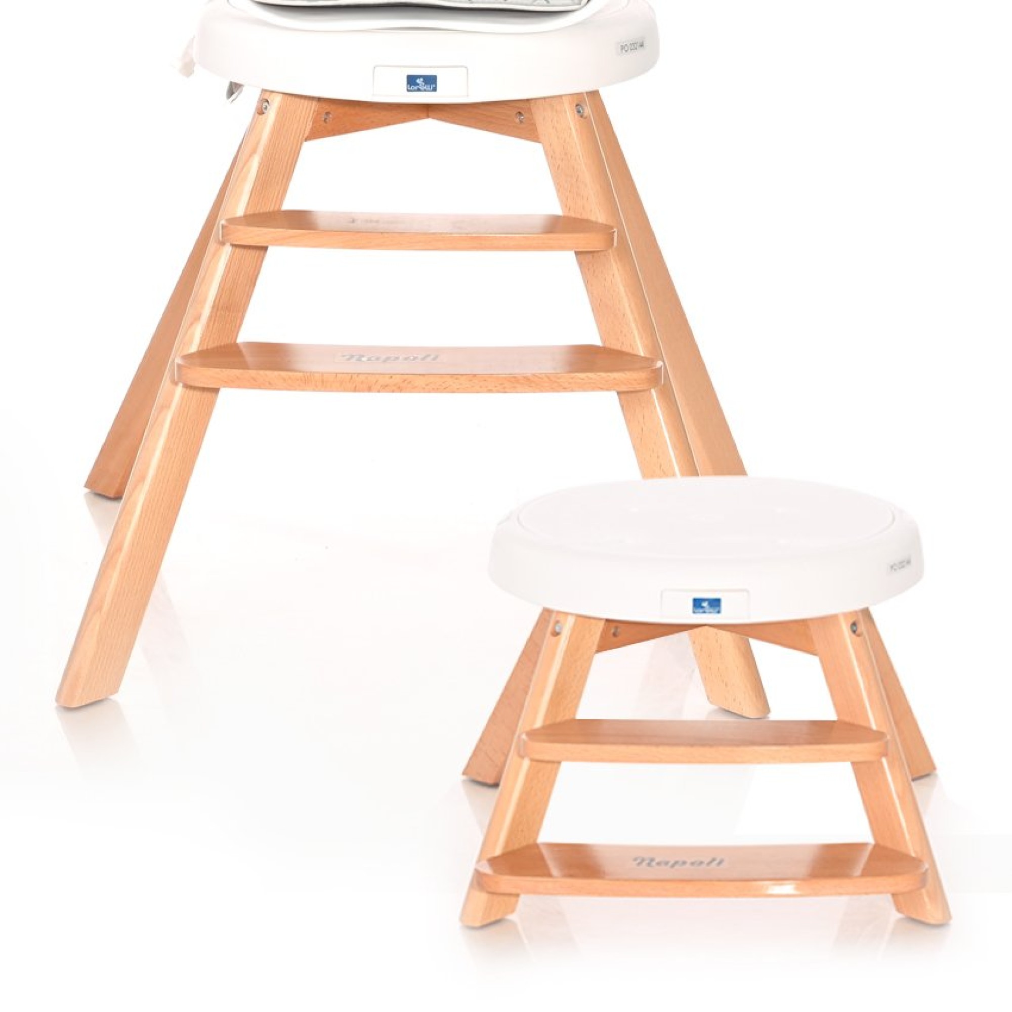 Висувний в 2-х положеннях столик з пахових обмежувачем забезпечений знімним підносом з виїмкою для пляшечки. Зручне сидіння з PU "дихаючим" еко шкіряним чохлом легко очищається, не втрачаючи при цьому початкового зовнішнього вигляду. У комплектацію входять довгі і короткі ніжки з натурального дерева з антиковзаючими накладками. Передбачені 2 підніжки для малюка і дитини, що підросла.