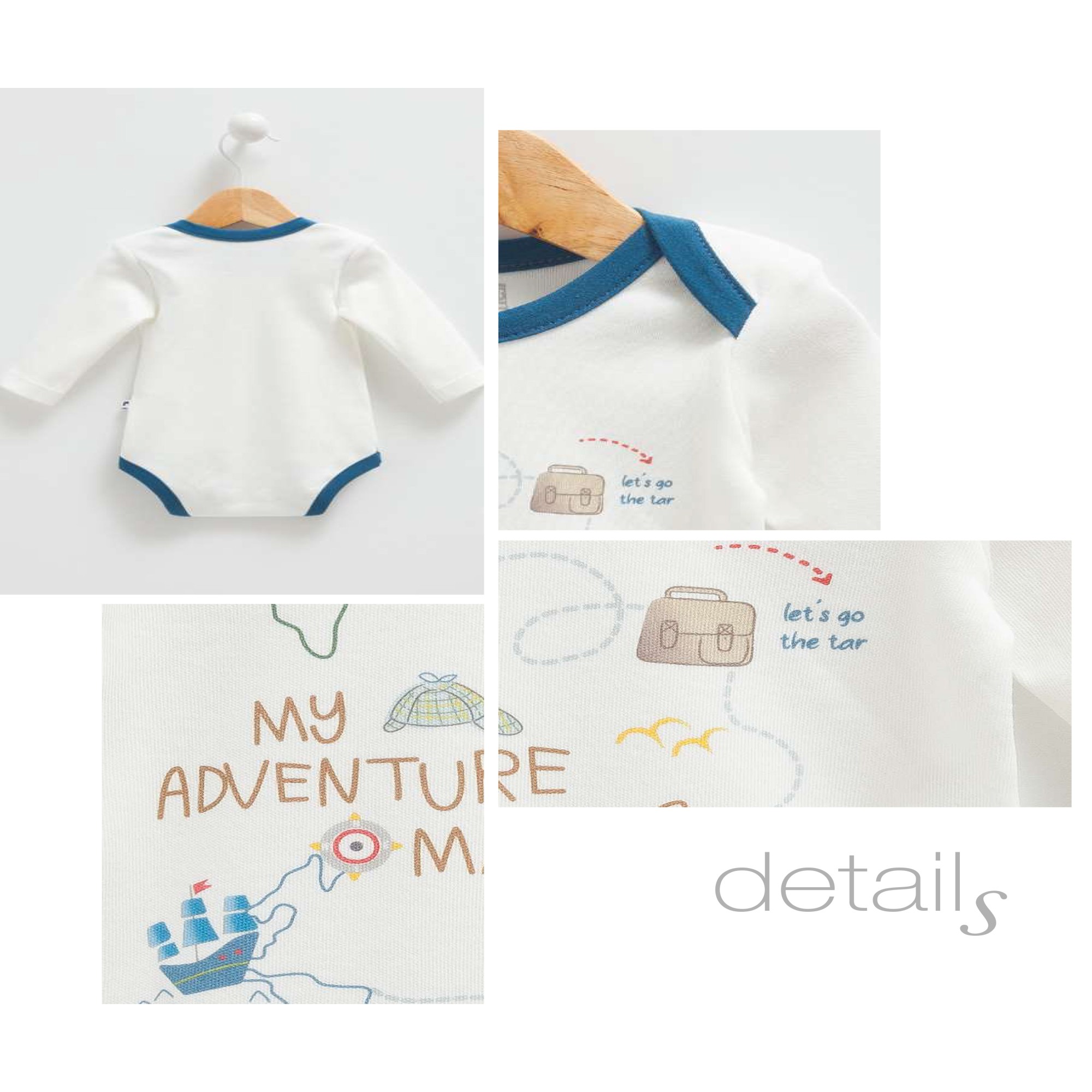 Боді виконаний в молочному кольорі з синьою окантовкою. Довгі рукава, приємний на дотик. Застібається внизу між ногами на кнопки. На плечах є додаткові відвороти, щоб малюкові було комфортно одягати боді через голову.