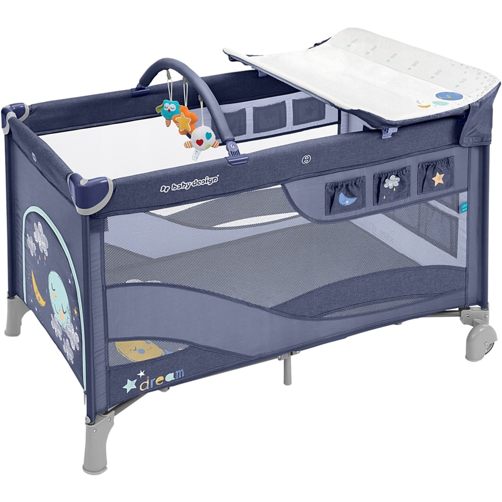 Манеж Dream універсальний - його можна використовувати як манеж. Додатково оснащений практичним пеленальним столиком, а для малюка – дугу з барвистими іграшками.