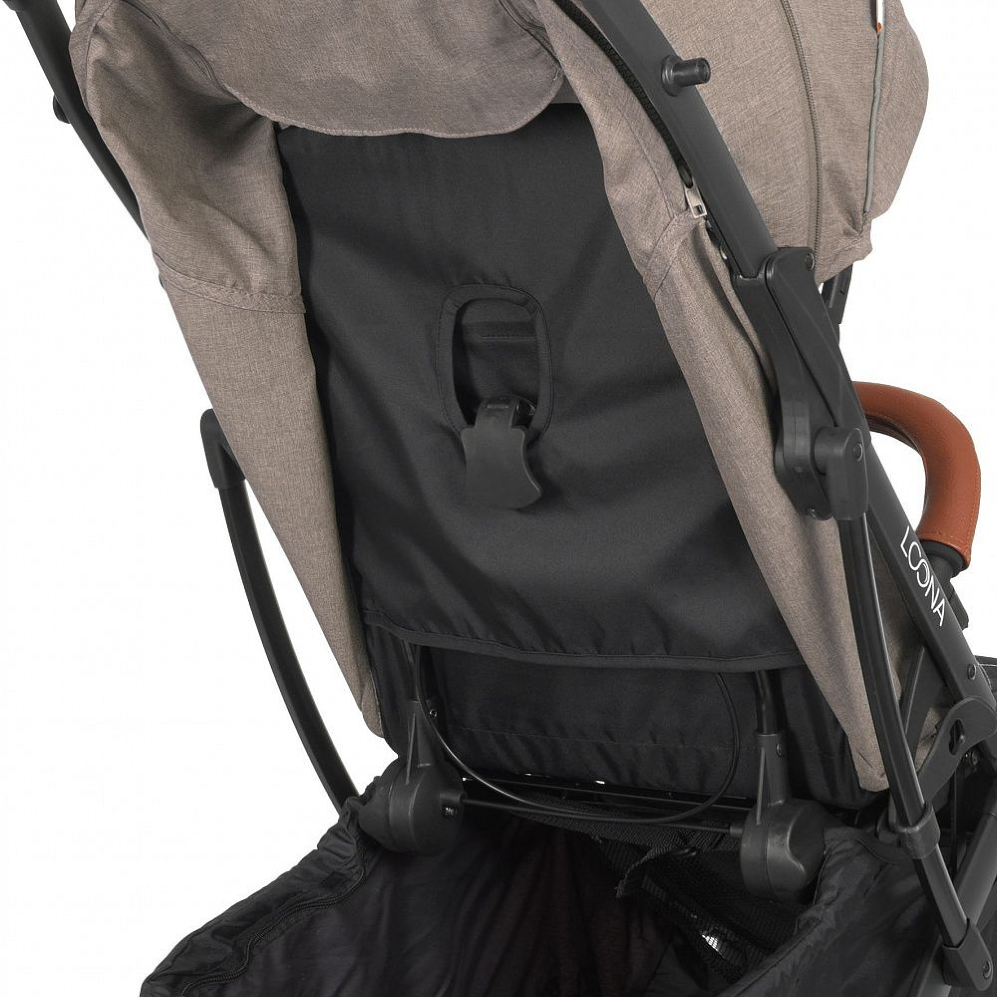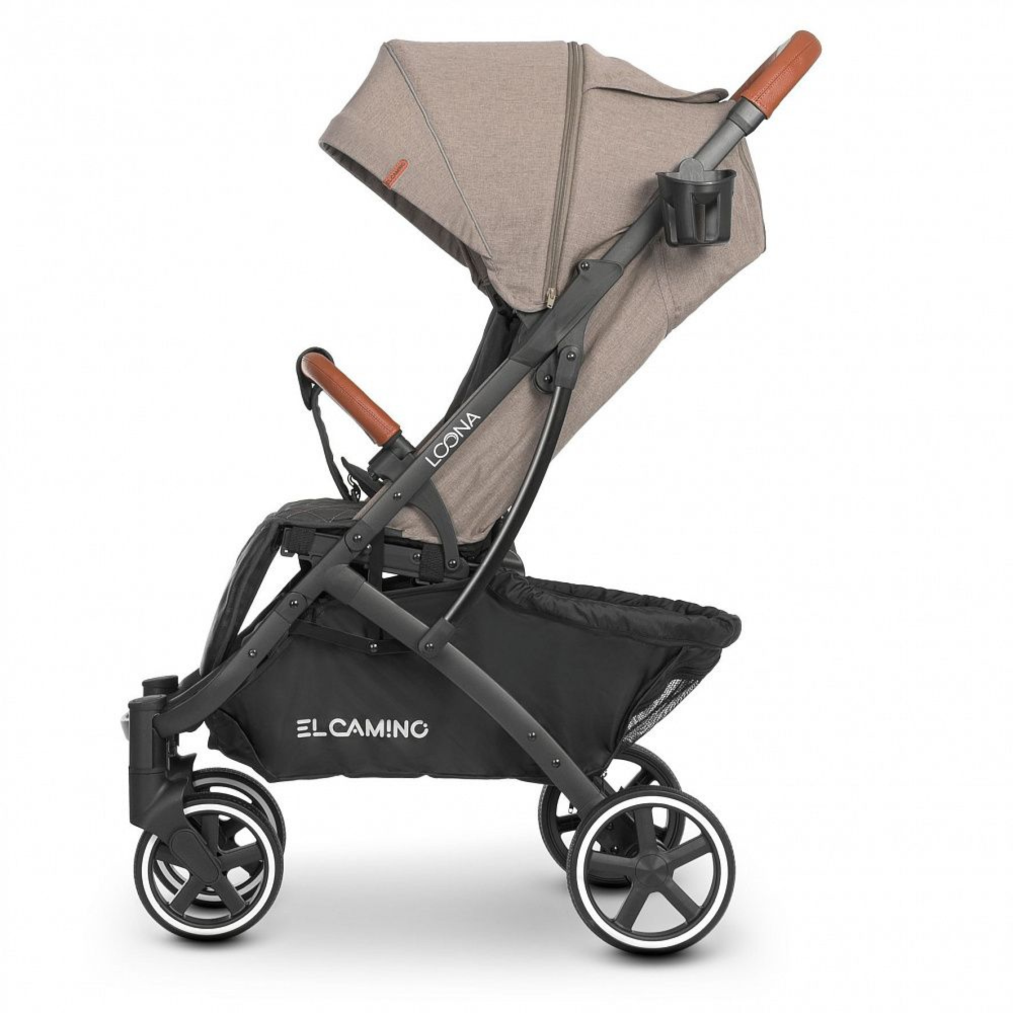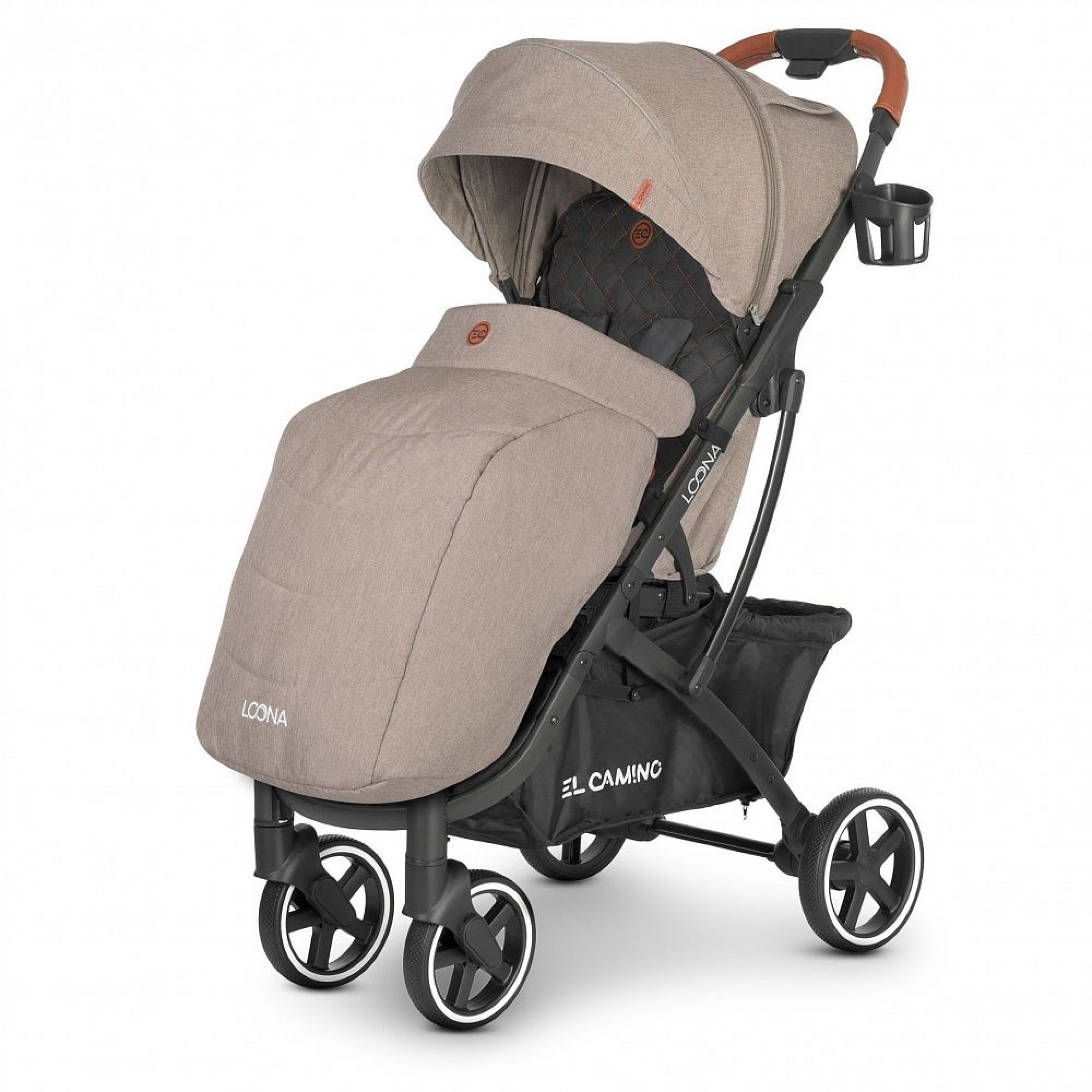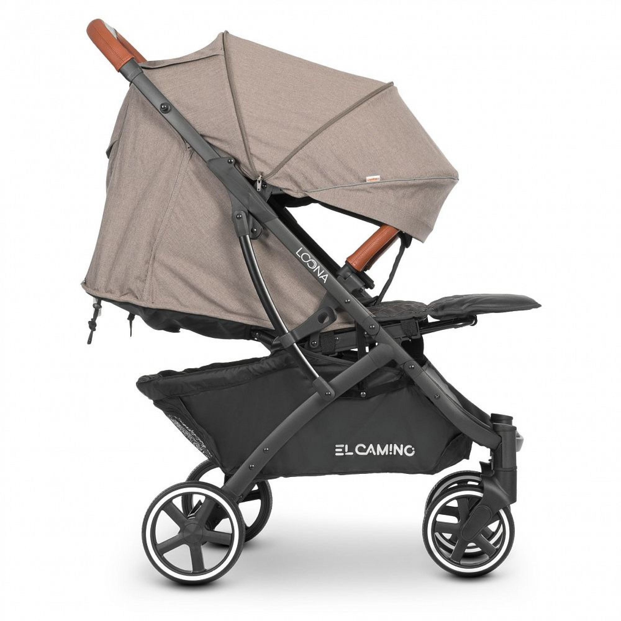Оббивка коляски виконана з льону, щільністю 300 D. Спинка коляски El Camino Loona регулюється за нахилом в 4 положеннях, глибокий капюшон оснащений додатковою секцією на блискавці і оглядовим віконцем. Для кращої вентиляції в спеку задню частину капюшона можна згорнути.