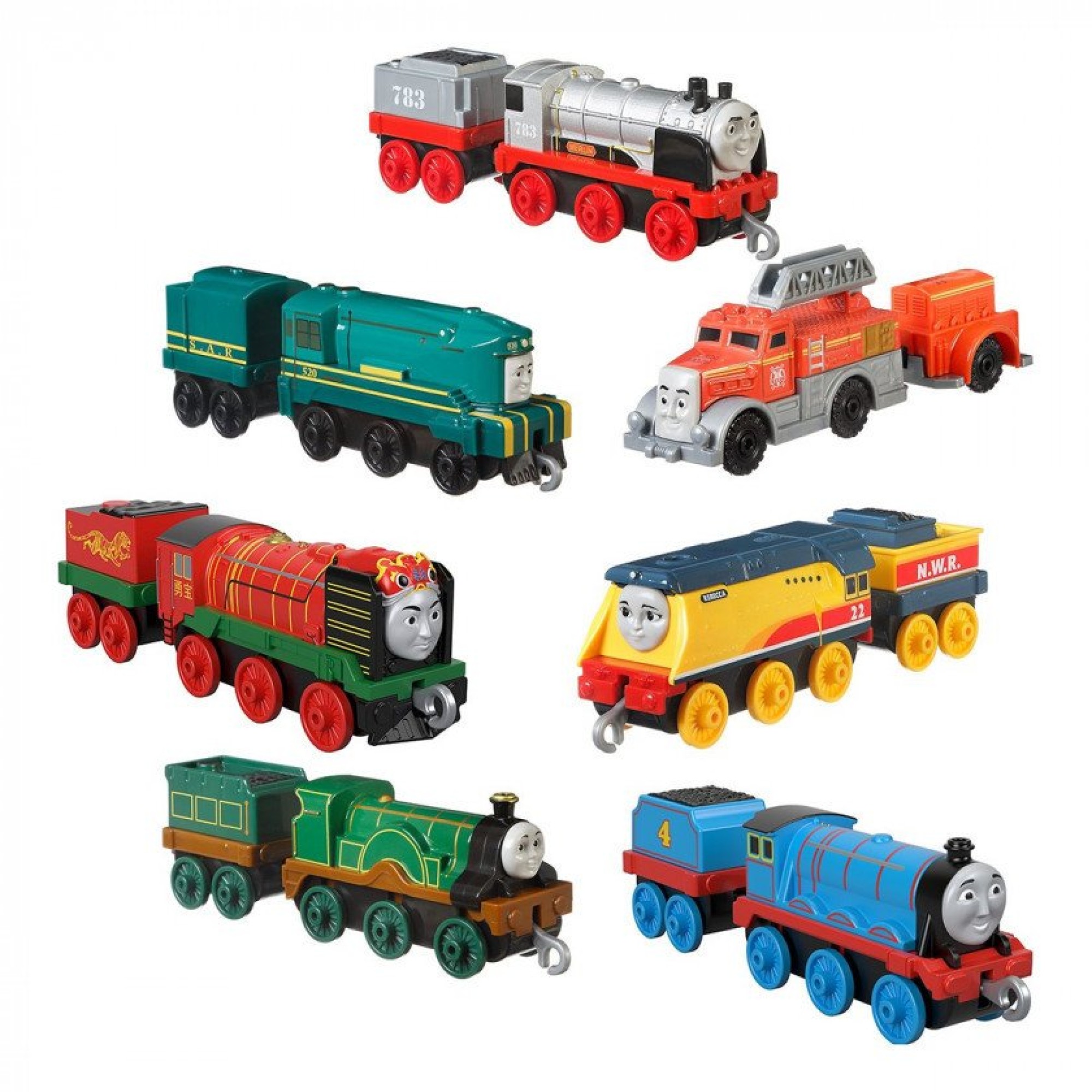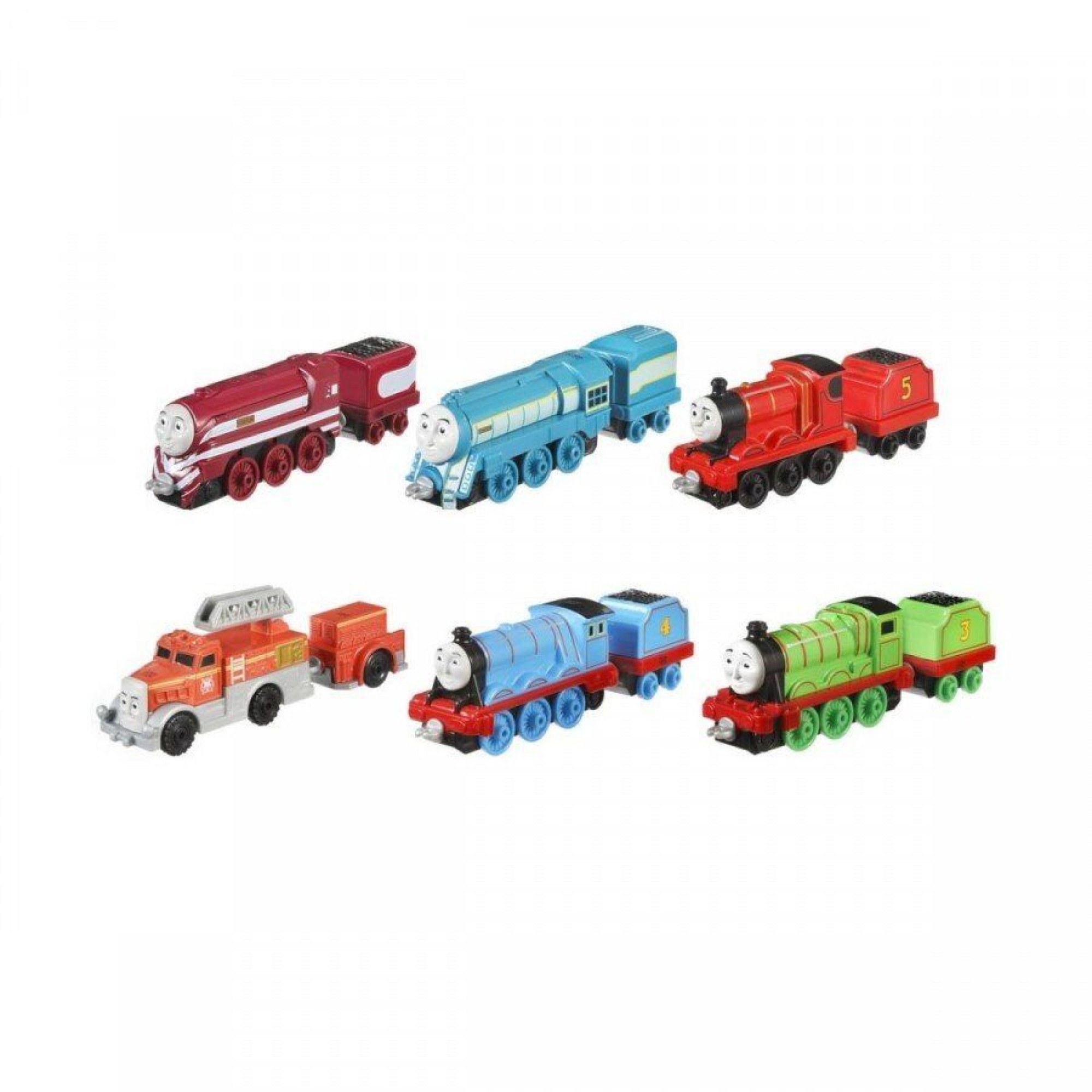 Паровозики Томас, Джеймс, Емілі, Гордон та інші. Кожен паровозик має свій вагончик. Представлені моделі – копії прототипів з мультфільму.