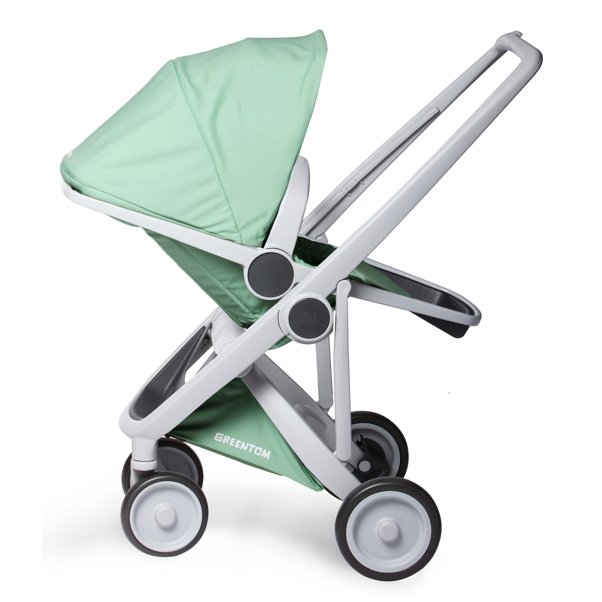 Greentom Upp Reversible на сірій рамі м'ятного кольору - легка і зручна еко коляска, як для малюків так і для батьків. Прекрасно підійде для походу на ринок або в супермаркет. Вона не займе багато місця в квартирі. Ви будете задоволені її маневреністю і легкістю.