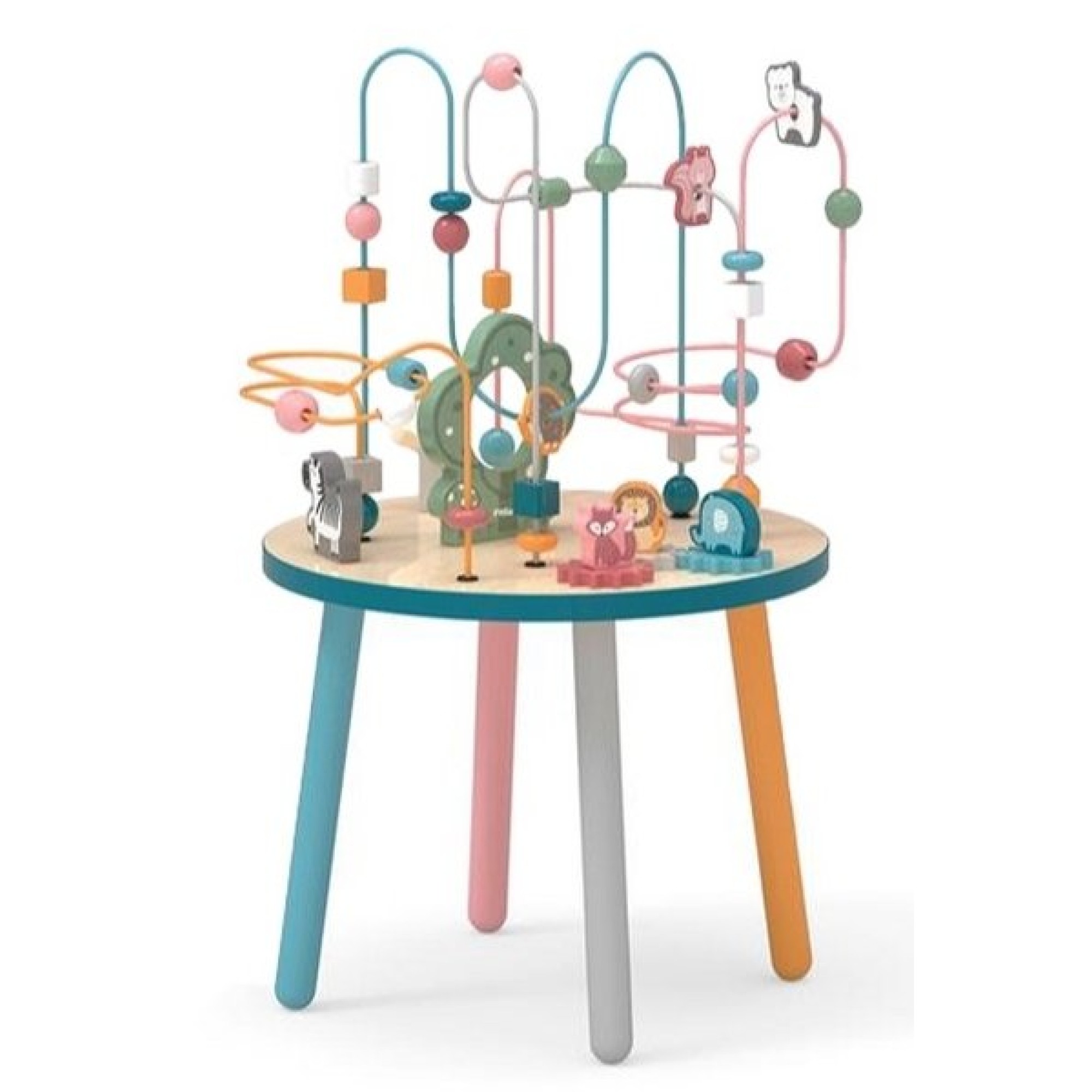 Ігровий центр Viga Toys (Віга Тойс) PolarB Стіл з лабіринтом складається з круглого столу з вбудованим дротяним лабіринтом з намистинами різних кольорів та форм, фігурками тварин, шестернями.
