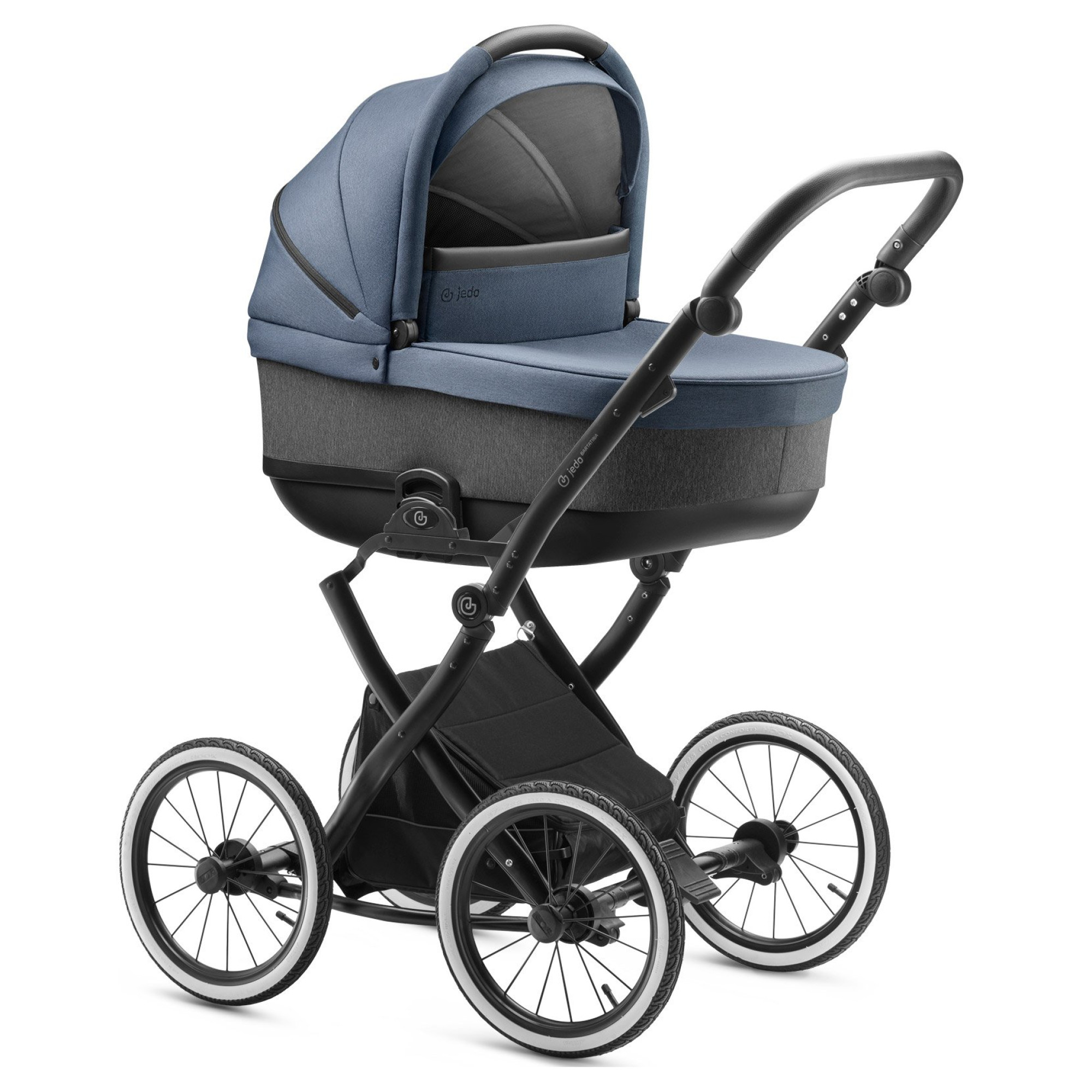 Jedo Bartatina поєднує в собі елегантний дизайн, функціональність, висока якість і простоту експлуатації. Коляска маневрена, легко долає перешкоди на будь-якій дорозі завдяки великим колесам і м'якій підвісці.