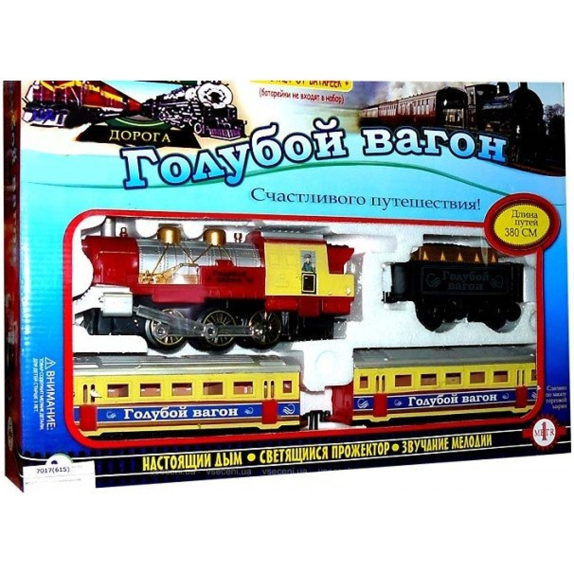 Залізниця Блакитний вагон (7017) – дитяча залізниця – улюблена іграшка іграшка всіх дітей на світі. Століттями залізниця з її паровозами, вагонами, шпалами та рейками приковувала до себе увагу всіх дітлахів. Навіть стаючи старшим, ми перетворюємося на дітей, коли бачимо на полиці магазину дитячу залізницю. Для роботи дитячої залізниці необхідні 2 батарейки типу D (1,5V) та 2 батарейки типу ААА (1,5V). У комплекті: 1 локомотив, 1 вагон із вугіллям, 1 пасажирський вагон та рейки (8 частин).