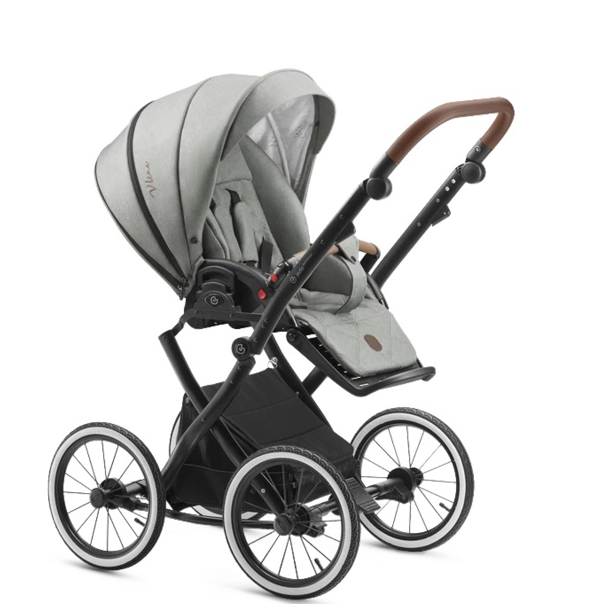 Алюмінієва рама оснащена надувними колесами і м'якою підвіскою, має регульовану ручку, обтягнуту еко-шкірою і місткий кошик для речей на блискавці.