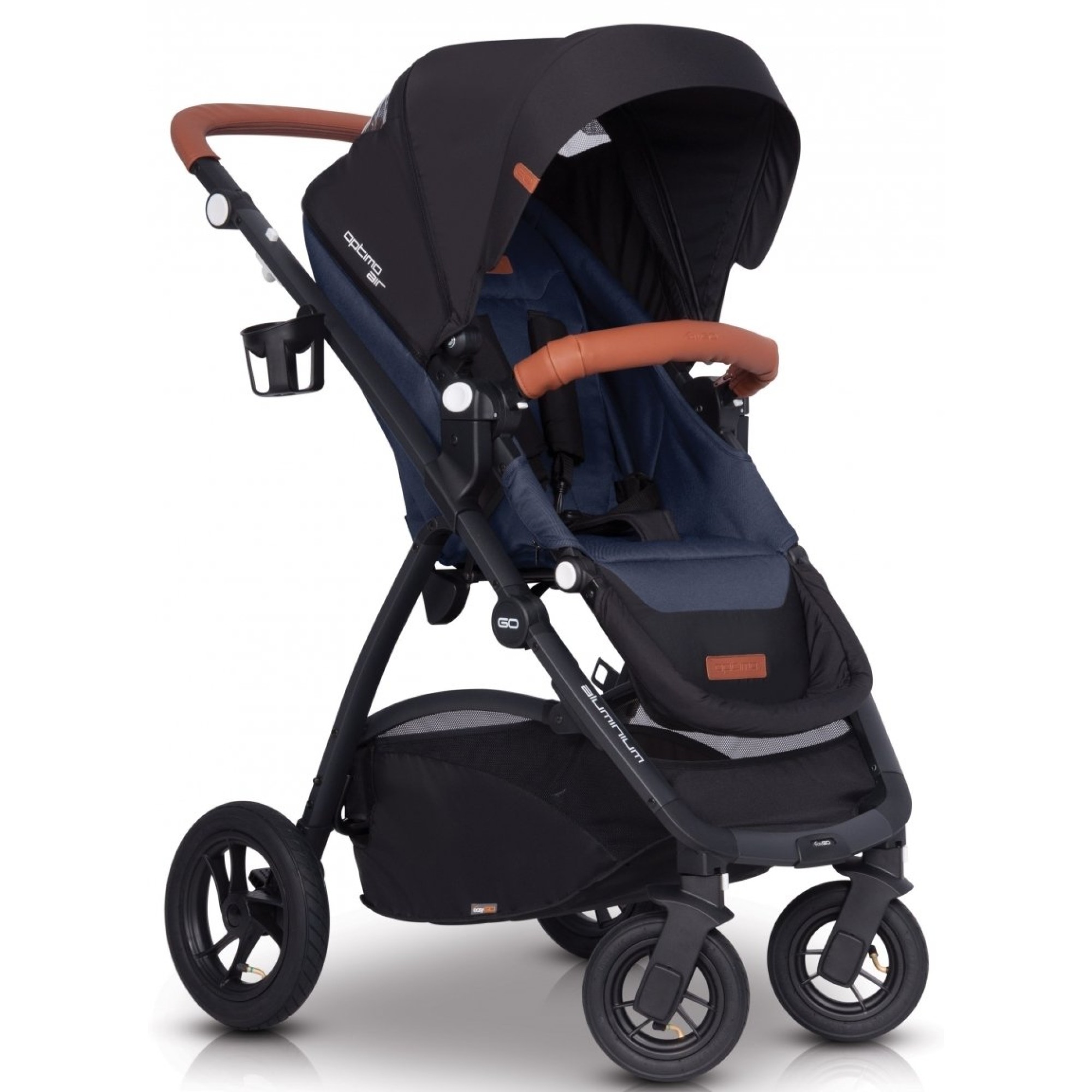 Рама коляски-книжки EasyGo Optimo Air складається разом з прогулянковим блоком, при цьому більш компактно коляска складається, якщо перед цим зняти всі колеса. Дизайн коляски втілює модні тенденції: чорний верх поєднується з модними відтінками та фурнітурою, створюючи стиль практичного мінімалізму. У комплекті йде великий дощовик, який повністю закриває прогулянковий модуль від опадів, при цьому для малюка передбачено віконце.