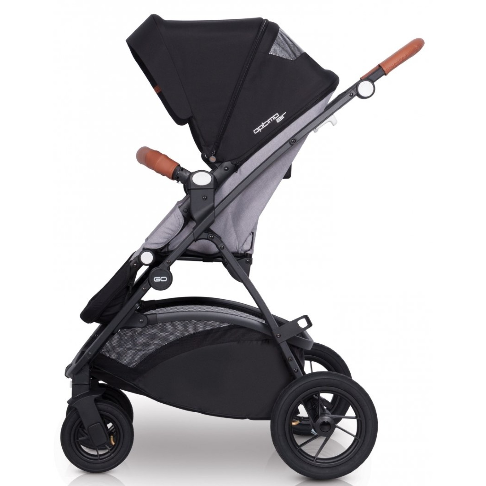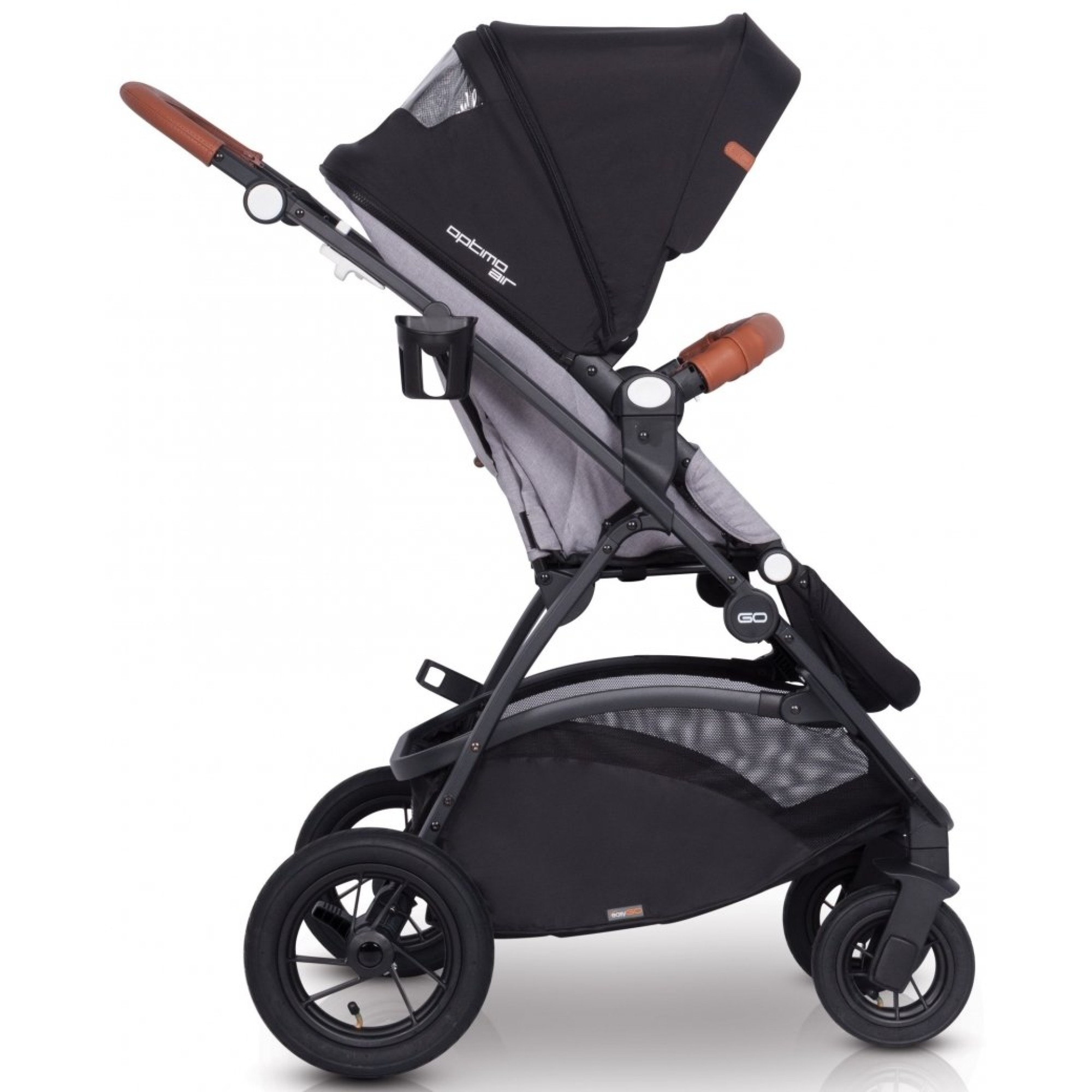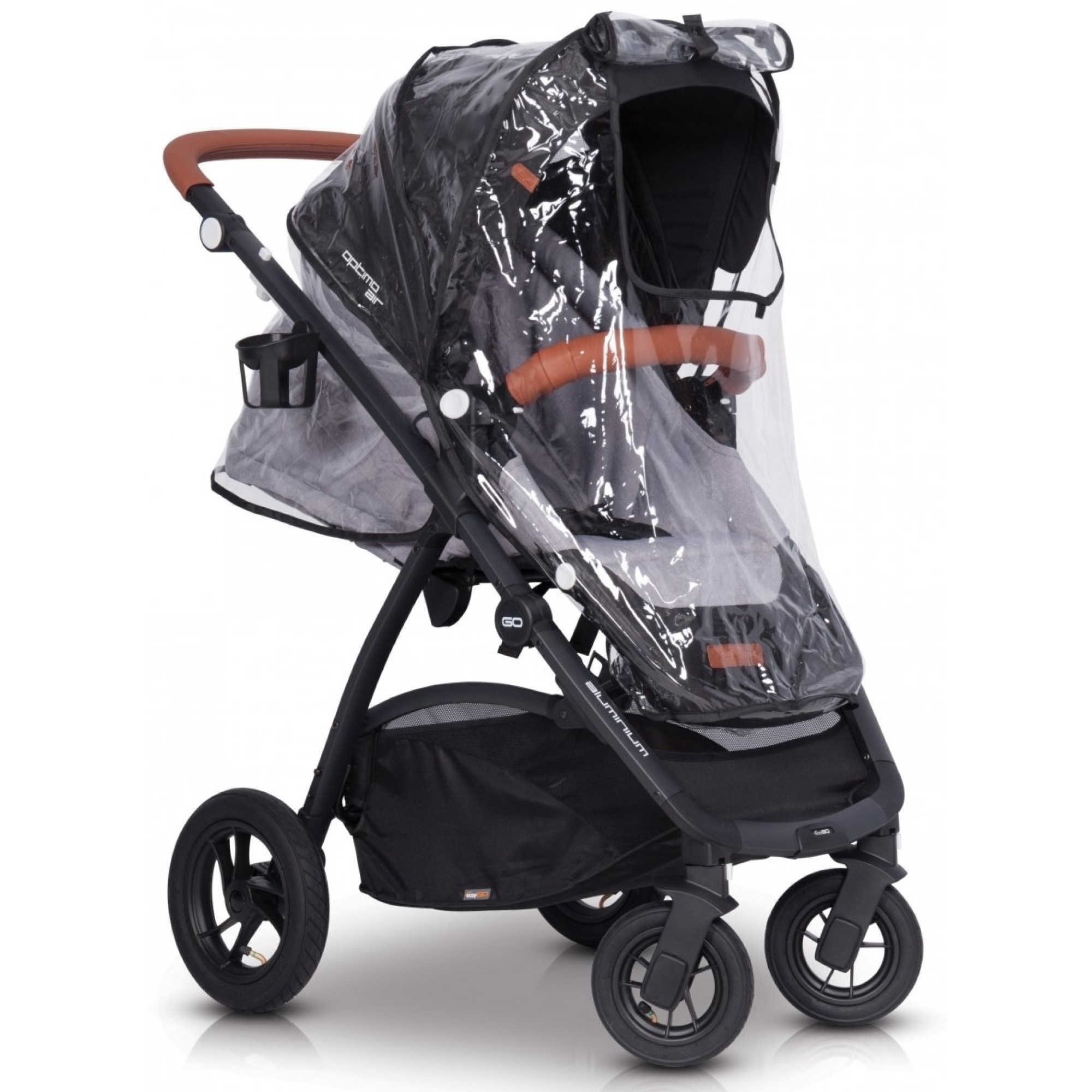 Рама коляски-книжки EasyGo Optimo Air складається разом з прогулянковим блоком, при цьому більш компактно коляска складається, якщо перед цим зняти всі колеса. Дизайн коляски втілює модні тенденції: чорний верх поєднується з модними відтінками та фурнітурою, створюючи стиль практичного мінімалізму. У комплекті йде великий дощовик, який повністю закриває прогулянковий модуль від опадів, при цьому для малюка передбачено віконце.