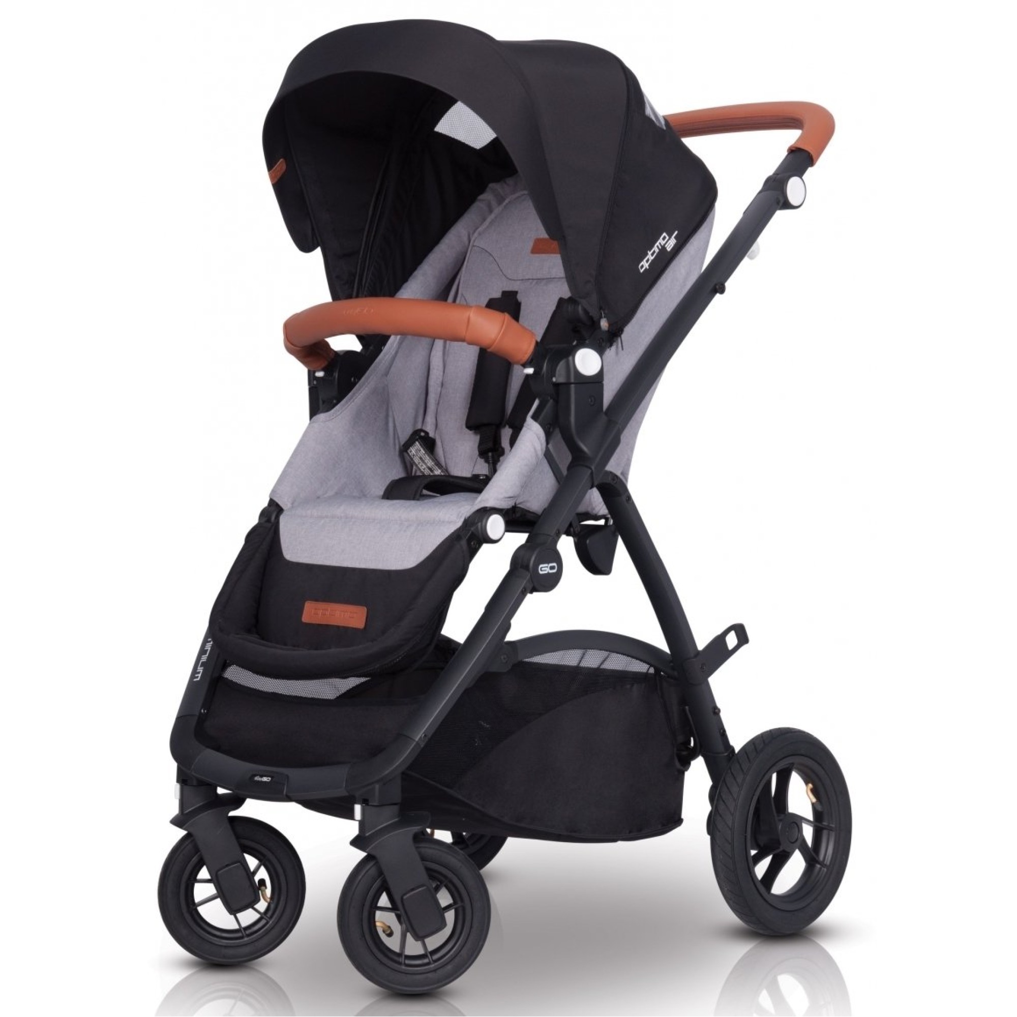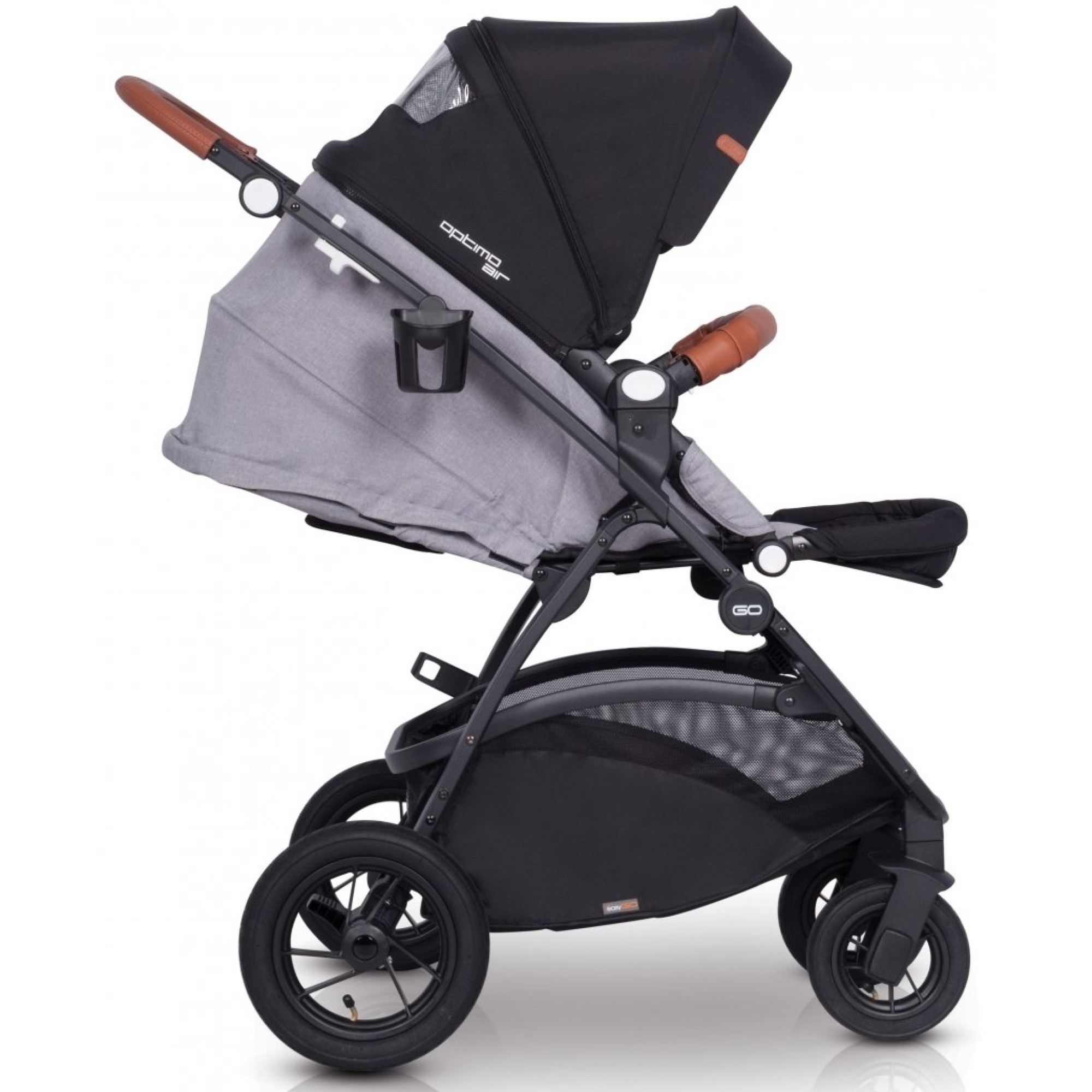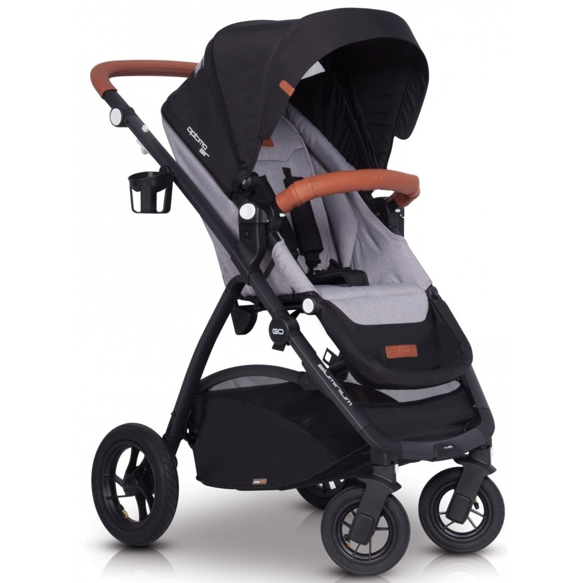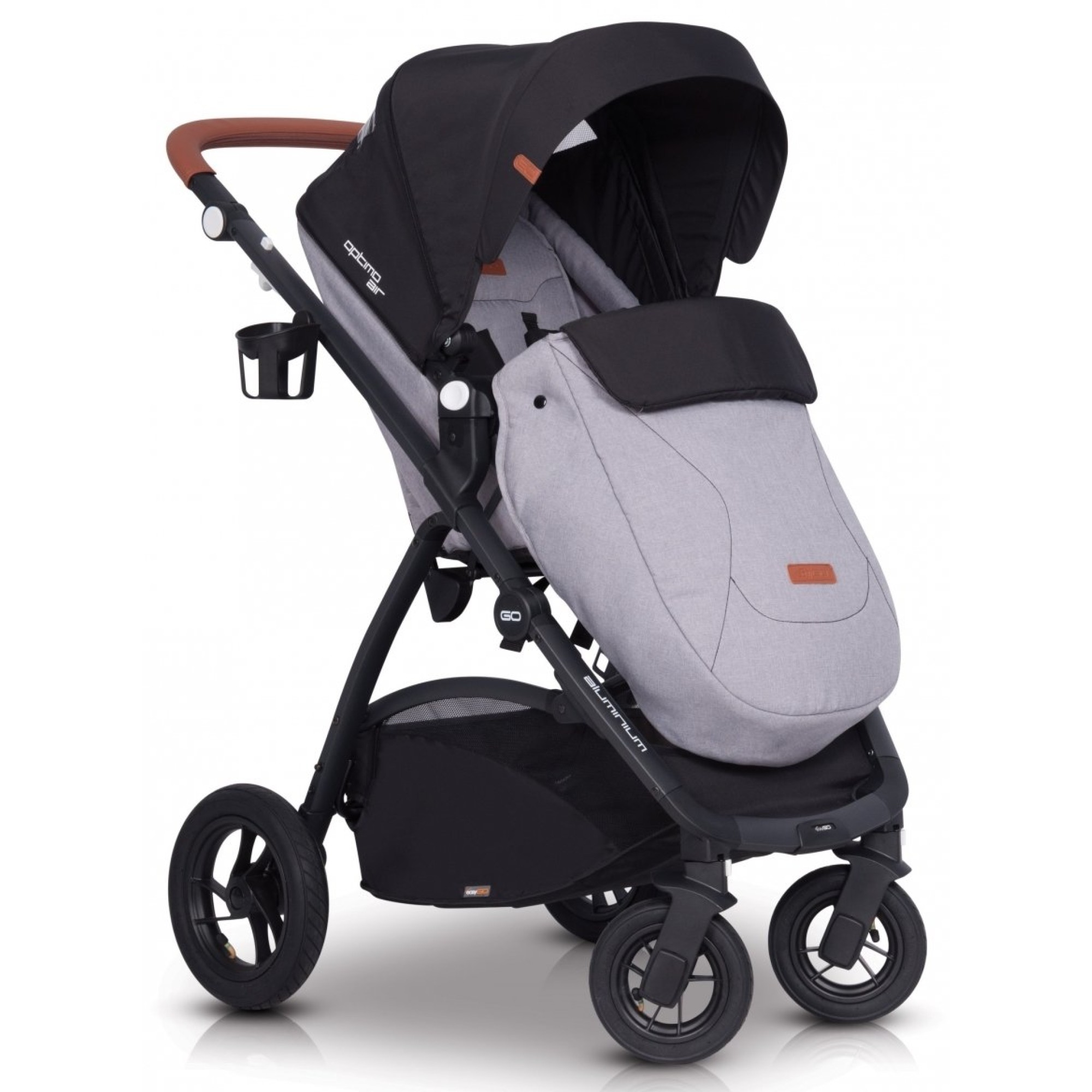 Рама коляски-книжки EasyGo Optimo Air складається разом з прогулянковим блоком, при цьому більш компактно коляска складається, якщо перед цим зняти всі колеса. Дизайн коляски втілює модні тенденції: чорний верх поєднується з модними відтінками та фурнітурою, створюючи стиль практичного мінімалізму. У комплекті йде великий дощовик, який повністю закриває прогулянковий модуль від опадів, при цьому для малюка передбачено віконце.