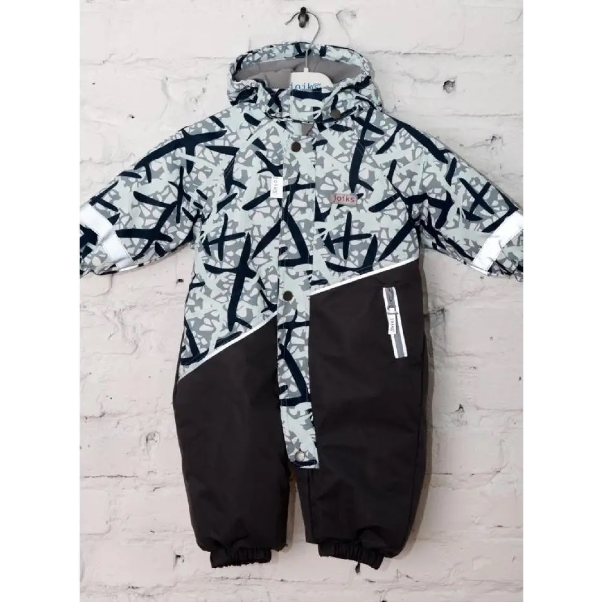 Комбінезон зимовий для хлопчика українського виробника Joiks розроблений з урахуванням всіх останніх тенденцій в дизайні і виробництві верхнього одягу. Верхня частина виробу виконана в білому забарвленні із зображенням абстракції, нижня частина - в сірому кольорі.