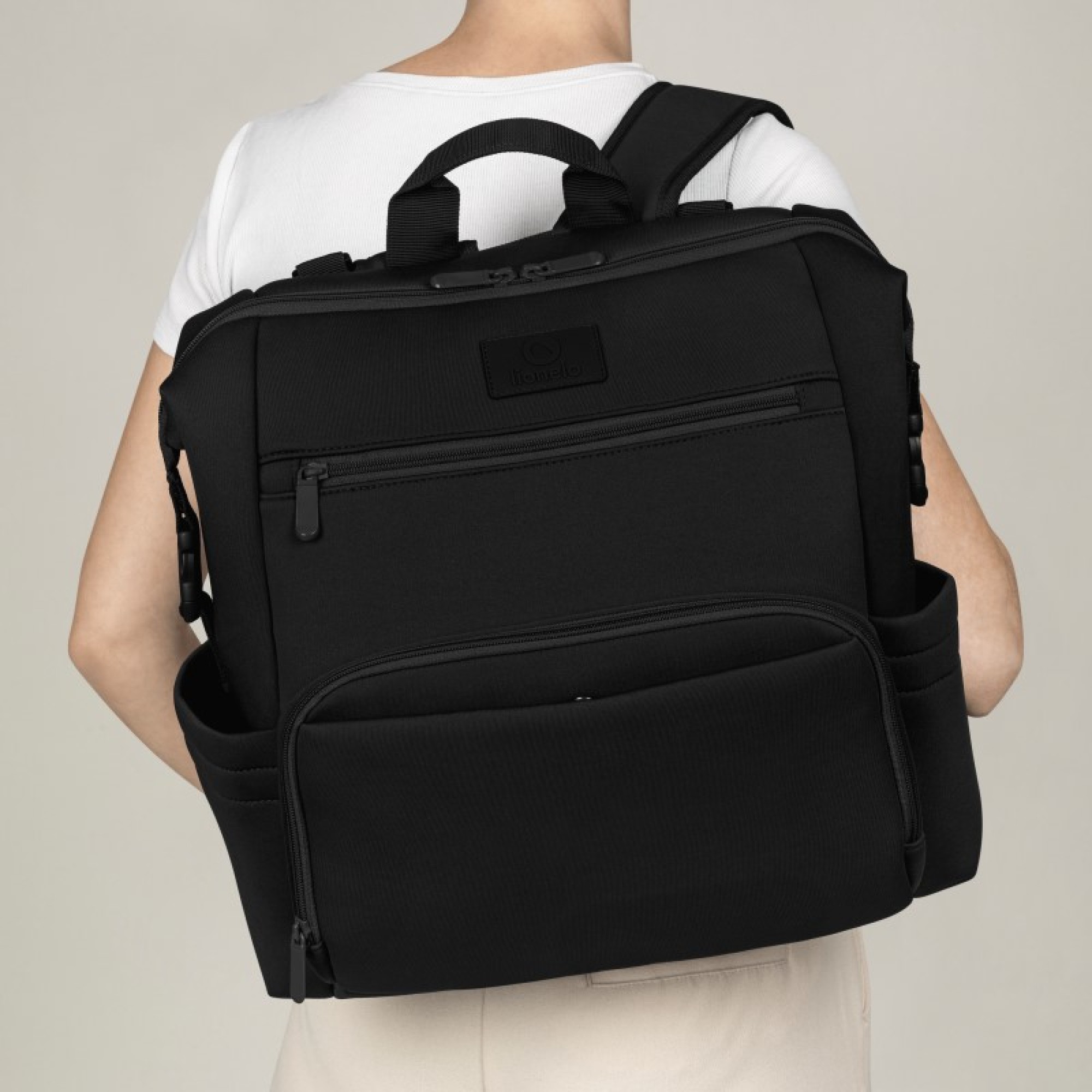 Ремені для підвішування до коляски дозволяють завжди тримати рюкзак під рукою. У комплект входить міні-пеленальний столик, що стане в нагоді для переодягання дитини будь-де. Рюкзак також ідеально підходить для мандрівників, оскільки його розміри відповідають нормам ручної поклажі в літаку. Завдяки пряжкам рюкзак можна регулювати за розміром, і він легко поміщається під сидінням. У спеціальній кишені для ноутбука зручно зберігати робоче обладнання.