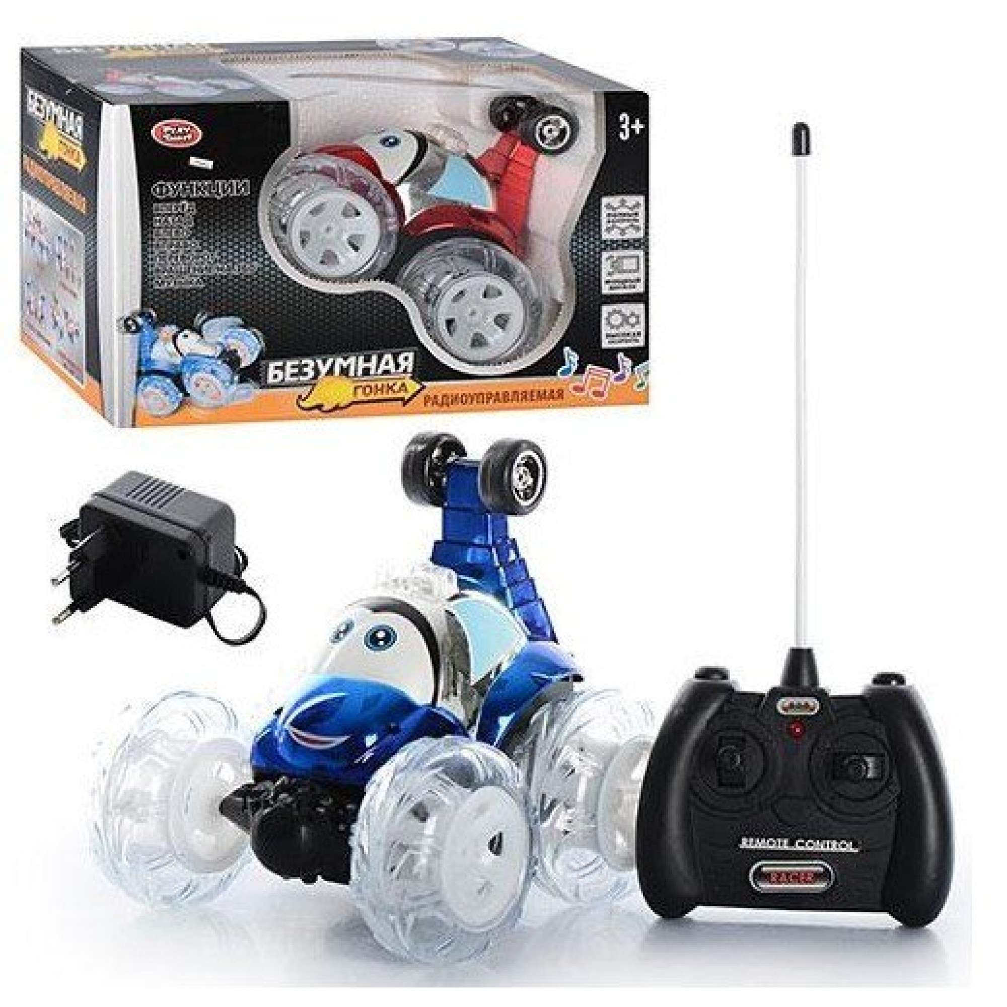 Размер машинки 17-16-15 см, работает от аккумулятора ( в комплекте), движение (вперед, назад,влево, вправо, переворот, вращение на 360), музыка, свет цветной (мигалки, корпус), колеса диаметр.7,5 см, пульт работает от кроны (в комплекте).